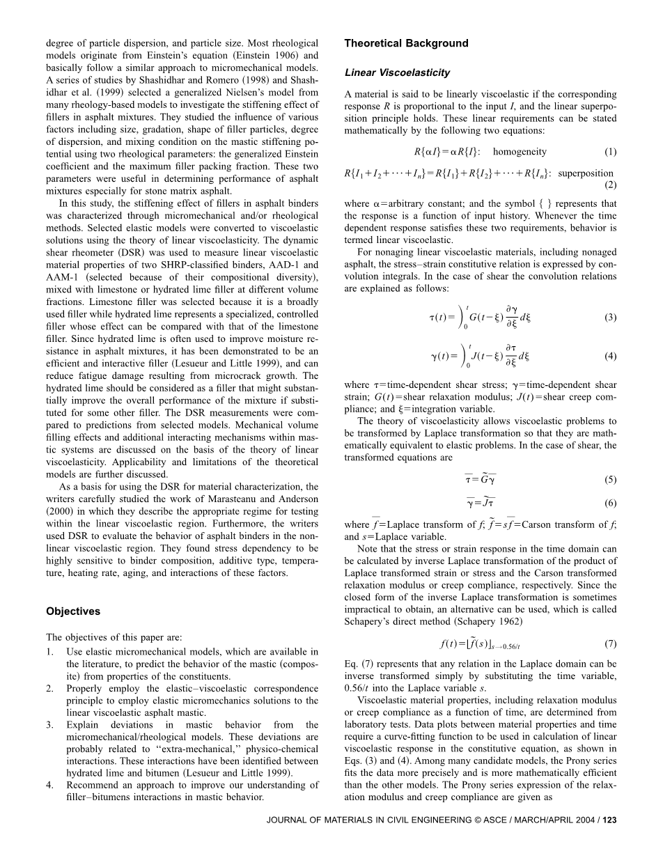 填料的沥青混合料的重要性已被安德森和戈茨广泛研究(1973年)哈里斯和斯图尔特(1995年),Kavussi和希克斯(1997年),Cooley等(1998年), 和别的。胶泥的质量,沥青粘合剂和填料的组合,会影响沥青混合物的整体机械性能以及铺装的可加工性。通常,由于填料的细度和表面特性,填料的作用是基于体积填料作用或填料与沥青之间的相互作用。后者的作用与理化方面有关,这些理化方面解释了沥青-填料系统的特定界面相互作用。Craus等。(1978年)通过对物理化学机理进行敏感性分析,对填充剂的几何形状,尺寸和表面活性进行分析,从而对各种乳香体系的物理化学方面进行了全面研究。他们证明了理化方面与填料-沥青界面的吸附强度有关。他们发现,较高的表面活性有助于在填料-沥青界面处形成更牢固的键合,并增加固定沥青的含量。Lesueur和小(1999年)描述了熟石灰发生反应完全不同与战略公路研究计划填充剂(SHRP )核心沥青AAD-1比采用SHRP核心沥青AAM-1高。他们假设熟石灰与AAD-1的许多极性组分相互作用,但在分散良好的AAM-1中相对惰性。流变学数据和分析研究证实了这一点。后来,Hopman等人证明了熟石灰和沥青之间的不同相互作用。(1999年),和Buttlar等人(1991年)。然而,填料在铺路混合物中的作用极为复杂,尚未得到充分解释。为了解释填料对沥青胶泥的机械影响,由于沥青胶泥在很宽的温度范围内都是粘弹性材料,因此有必要先评估其粘弹性材料的性能,例如蠕变柔度和/或松弛模量。尽管已花费大量的实验工作来解释胶泥系统的加强效果,但很少有人尝试采用基于力学的严格方法。预测填料硬化效果的有前途的方法之一是基于微力学的方法。传统上,微力学已被用于基于各个成分的特性来预测有效的复合材料特性。每种成分的相对比例;以及几何信息,例如相位,形状和方向。微机械模型已被证明在复合材料混合物设计中非常有用,因为它们能够识别微尺度特征并代表宏观行为。在颗粒复合力学领域中,已经针对弹性材料开发了几种不同的分析微力学模型。通过采用弹性-粘弹性对应原理,可以将这些弹性模型应用于粘弹性问题。Hashin的几项研究(1965年,1970年)和克里斯滕森(1969年)讨论了将弹性解应用于粘弹性问题的可能性。最近,Buttlar等人。(1999年)为了研究沥青胶泥中的增强机理,采用了微机械模型。用于量化胶泥的加强效果的另一种方法是基于流变学的方法,该方法考虑了由于颗粒聚集,颗粒分散度和粒径而引起的流变行为的变化。大多数流变模型都源自爱因斯坦方程(爱因斯坦1906年)基本上遵循类似的方法建立微机械模型。Shashidhar和Romero的一系列研究(1998年)和Shashidhar等。(1999年)从许多基于流变学的模型中选择了广义的尼尔森模型,以研究沥青混合料中填料的硬化作用。他们使用两个流变参数:广义的爱因斯坦系数和最大填料填充分数,研究了各种因素,包括尺寸,等级,填料颗粒的形状,分散度和混合条件对乳香刚度的影响。这两个参数可用于确定沥青混合料的性能,特别是对于石基质沥青。在这项研究中,通过微机械和/或流变学方法表征了填料在沥青粘结剂中的硬化作用。使用线性粘弹性理论将选定的弹性模型转换为粘弹性解。动态剪切流变仪(DSR )用于测量线性2 SHRP分类的粘合剂的粘弹性材料的特性,AAD-1和AAM-1 (选择,因为它们的组成的多样性),以不同的体积分数与石灰石或熟石灰填料混合。选择石灰石填料是因为它是广泛使用的填料,而熟石灰代表一种特殊的受控填料,其效果可与石灰石填料相比。由于熟石灰经常被用来提高沥青混合料的防潮性,它已被证明是一种高效,互动的填料(Lesueur和1999年小),并可以减少因微裂纹增长而导致的疲劳损伤。熟石灰应被认为是填充剂,如果代替某些其他填充剂,则可以显着改善混合物的整体性能。将DSR测量值与所选模型的预测值进行比较。在线性粘弹性理论的基础上,讨论了乳香体系中的机械体积填充效应和其他相互作用机制。理论模型的适用性和局限性将进一步讨论。
