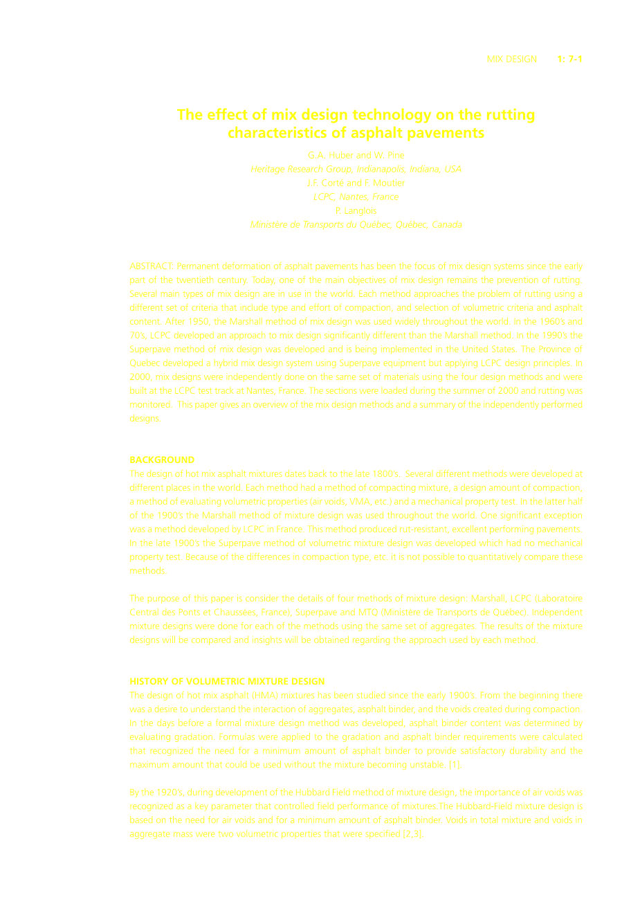 摘要:自20世纪初期以来,沥青路面的永久变形一直是混合设计系统的重点。如今,混合设计的主要目标之一仍然是防止车辙。世界上使用了几种主要类型的混合设计。每种方法都使用一组不同的标准来解决车辙的问题,其中包括压实的类型和强度以及对体积标准和沥青含量的选择。1950年后,马歇尔混合设计方法在世界范围内广泛使用。在1960和70年代,LCPC开发了一种混合设计方法,与马歇尔方法大不相同。在1990年代,Superpave混合设计方法得以开发,并在美国得到实施。魁北克州使用Superpave设备但采用LCPC设计原则开发了混合混合设计系统。在2000年,使用四种设计方法在同一套材料上独立进行混合设计,并在法国南特的LCPC试验场上进行了建造。这些断面在2000年夏季加载,并监测车辙。本文概述了混合设计方法,并对独立执行的设计进行了总结。