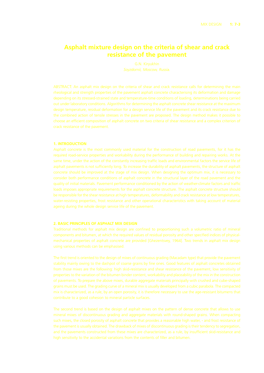 摘要现行设计方法的不足之处,往往与试验方法的不完善有关,其规定的性能指标不能很好地反映沥青混凝土路面的实际情况。在这方面,已知的技术“Superpave”[1996,1997]是向前迈出的一步,因为它的目的是根据沥青结合剂的质量、混合成分和其运行的气候条件来预测沥青路面的效率。但是引进美国的Superpave混合设计技术却因为设备的困难和昂贵而受阻。因此,许多国家对沥青混合料设计的新方法进行独立调查和开发。俄罗斯在研究路面沥青混凝土的结构-力学性能和设计道路路面方面也具有巨大的科学潜力,可以而且必须用于沥青混合料的设计。为了优化沥青路面的配合比,建议在室内试验的基础上,尽可能准确地确定沥青路面在混凝土条件下的使用性能。