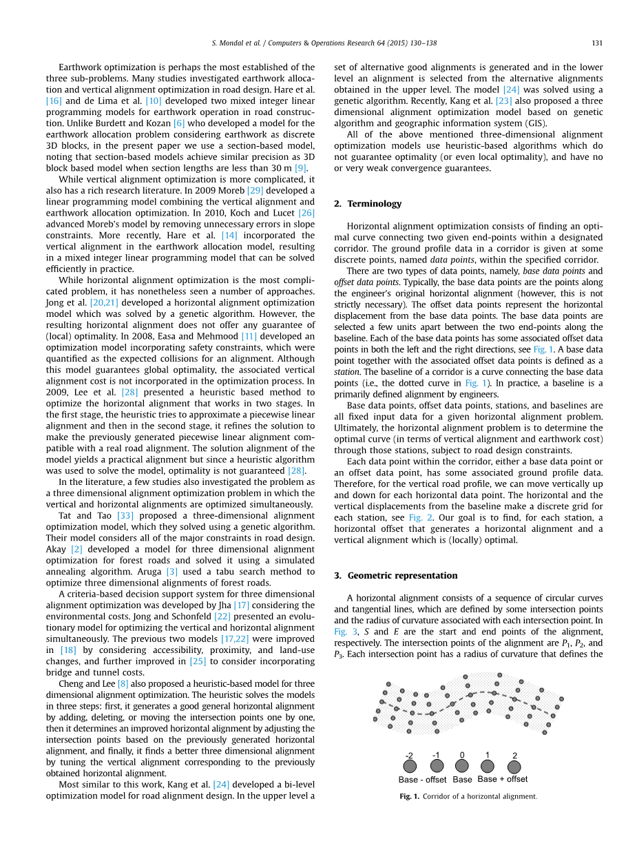 虽然水平线形优化是最复杂的问题,但它仍然出现了许多方法。Jong等。 [20,21]开发了水平线形的优化模型,它是由遗传算法求解。然而,导致水平对齐方式不能提供任何保证(局部)最优。在2008年,Easa 和Mehmood [11]开发了一种优化模型结合安全限制,这是为量化预期线形的冲突。虽然这种模式保证了全局最优性,但相关的垂直线形成本未在优化过程中并入。在2009年, Lee等人。 [28]提出了一种启发式基础的方法来优化水平线形,它在两个阶段的工作。在第一阶段中,启发式试图近似的分段线性定线,然后在第二阶段中,它改善解决方案到使以前生成的分段线性排列与真正的道路线形兼容。此线形解决方案模型产生实际的调整,但由于一个启发式算法被用于求解该模型,最优不能保证[28]。