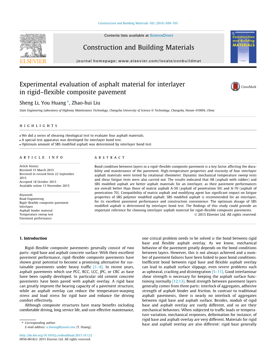 刚性-柔性复合路面一般包括两个部分:刚性基础和沥青混凝土表面。由于他们的出色的路面使用性能,刚性-柔性复合路面显现出成为重交通下可持续路面的可靠选择的巨大潜力。在最近几年,使用PCC, RCC, LCC, JPC, or CRC为基底的沥青路面得到迅速发展。特别是旧水泥混凝土路面加铺沥青路面。刚性基础能大大提高路面结构承载能力,并且加铺沥青路面可以减少温度的翘曲应力,刚性基础荷载应力和有效加强行驶舒适性。虽然复合结构有许多好处,包括行驶舒适,使用寿命长,维护费用低。一个需要解决的关键问题是刚性基础和柔性沥青路面之间的粘结。正如我们所知,路面的机械性能很大程度上取决于层与层之间粘结情况。但是,这并不总是能实现的并且路面病害的数目已经与低效的粘结状况相联系。刚性基层和柔性沥青加铺层之间低效的粘结可导致沥青面滑移,甚至出现严重的问题,如:隆起,开裂,破碎。良好的层间剪切强度是保持沥青表面功能正常所不可缺少的。路面层间粘结强度一般来自三个部分:集料的咬合力,沥青结合料的粘结力,和摩擦力。和传统沥青路面相比,在刚性基层和沥青路面之间几乎没有集料的咬合力。此外刚性基础和沥青路面的模量有很大不同,机械性能也有很大不同。例如,当受到交通荷载或温度变化,机械响应,变形时,刚性基层和沥青加铺层是非常不同的。刚性基层和沥青加铺层的材料也有很大不同:刚性基层一般采用水泥混凝土,但沥青加铺层采用沥青混合料。这使得刚性基层和沥青加铺很难工作协调。弱黏结,刚性基层和沥青加铺层的模量和材料差异突出了在刚性柔性符合路面中的粘结状况。为改善刚性基层和沥青加铺层间的粘结,中间层被使用来保证路面的两个部分表现如单一实体,以减少路面病害。有三种主要的层间结构以提高刚性柔性复合路面的粘结,由不同的施工方法分类:喷涂层,沥青浸渍织物层,并铺层。喷涂层通过在较低的刚性基层上喷洒沥青材料来构造,并用一些单一大小的随时来提高咬合强度。浸渍织物层间是一种“sandwich结构”,用土工合成材料和沥青材料制成。铺层是SAMI(应力吸收层)。基于已有工程经验在新建刚性柔性复合路面推荐使用喷涂层,因为其操作简单、成本低、质量好。建议在旧路面沥青修复使用铺层,因为它不仅可以加强粘结,而且还吸收压力和延缓反射裂缝的发展。在所有的三种中间层,沥青是主要的材料。沥青的性质直接影响中间层的性能。