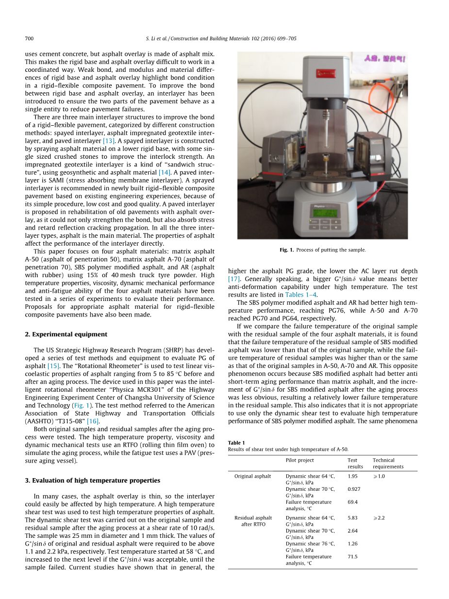 在许多情况下,沥青加铺层是薄的,所以层间沥青易受高温影响。采用高温剪切试验对沥青高温性能进行测试。对原始样本进行动态剪切试验,老化后的剩余样本剪切速率为10 rad/s。样品直径为25毫米, 厚度为1毫米。原始样本和剩余沥青的G*/sindelta;值分别要求大于1.1和2.2 KPa。试验温度起始为58摄氏度,并且如果G*/sindelta;满足要求则,直到样品不符合提高至下一个温度等级,直到样品不符合。目前的研究已经表明,在一般情况下,沥青PG等级越高,沥青层车辙深度越小。一般来说,一个更大的G*/sindelta;值意味着更好的高温抗变形能力。测试结果列于表1-4。