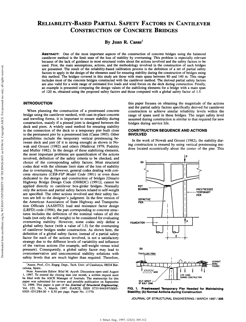 预应力混凝土在采用悬臂挂篮现浇混凝土施工法时,保证施工期间的稳定性是非常重要的,尤其是当桥面和墩之间有较的情况。为保证施工期稳定性而广泛采用的方法是使用预应力杆在永久墩台附近设置临时支柱,并施加竖向预应力,从而使墩梁固结(Casas1993)。其他的墩梁之间施加临时垂直预应力(如果强度足够)的可能性可参考Nowak和Grouni(1982)以及其他人(Mathivat 1979;Podolny 和Muller 1982)。在这些稳定元素的设计中,最重要的问题是对所有的作用力,检验的安全标准,以及相关安全系数的选择。大多数的结构模型只考虑了由于倾覆而导致失稳的极限状态。然而,通常的混凝土结构规范(CEB-FIP Model Code 1991或另一些桥梁设计施工的规范[Ontario Highway Bridge Design Code(OHBDC)(1991)],不能直接应用于悬臂箱梁。通常只有与自重相关的作用力和部分安全因数会被规定,而其他的作用力及其安全因数却被人为忽略了。在美国州际高速公路和运输协会(AASHTO)第一版的荷载和阻力因素设计规范(LRFD 1994)中,在考虑倾覆稳定性时,考虑了混凝土结构的所有荷载(不仅仅是自重)的额定值。然而,一些规范针对桥梁的悬臂施工只定义了总安全系数(取值1.5)。通过证明,以总安全系数替代每一个作用力的部分安全系数并非满意的方法,因为不同作用力的变化程度和影响是不同的(例如自重和风压的关系)。因此,总安全因数提供的是远超实际需求的安全等级、并可能得出过于保守和不经济的稳定性方案。因此,本文的重点就是获得跨径在80~140m的桥梁的各种作用力的量级及其部分安全系数,尤其是在可靠性等级不变的情况下,求得在悬臂施工时施工中的目标安全系数。
