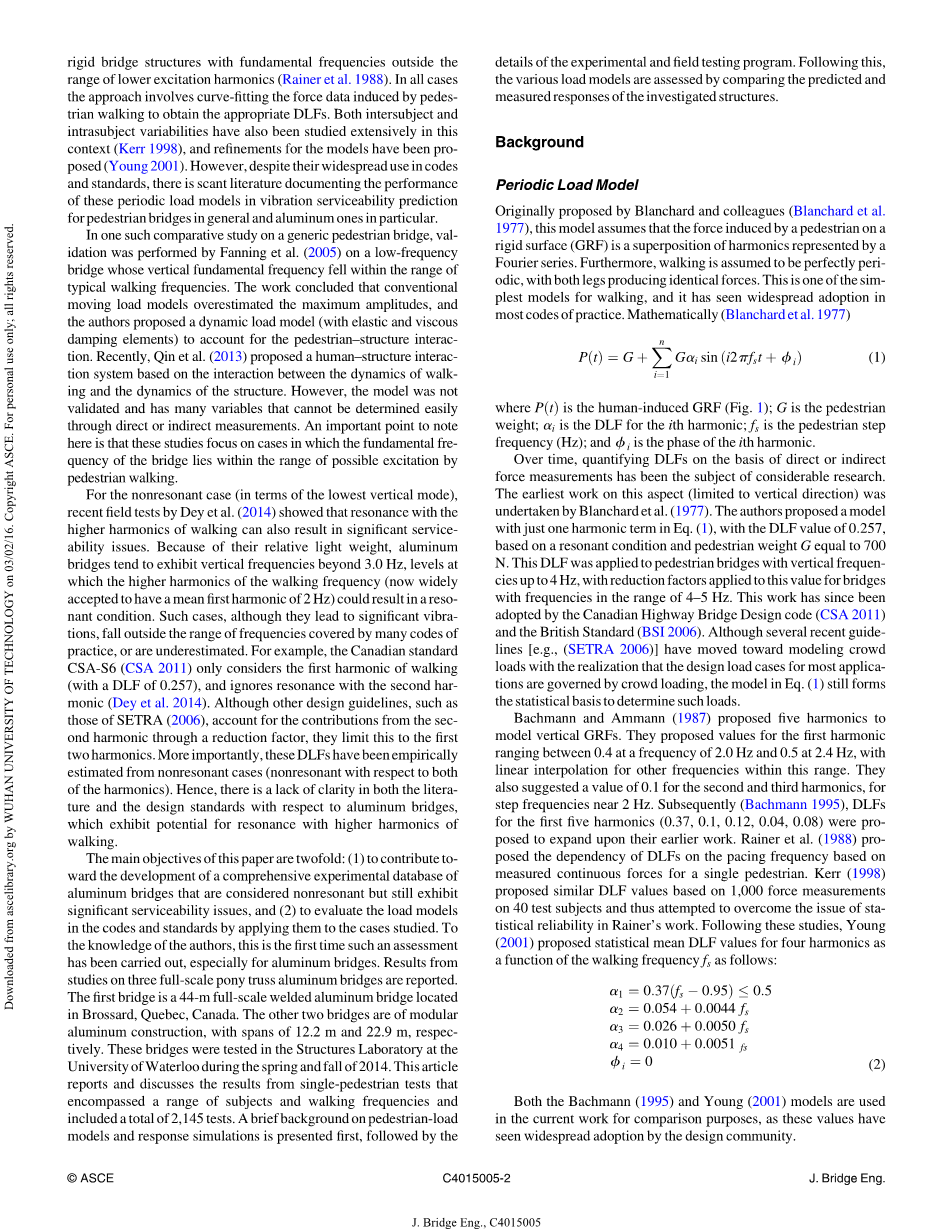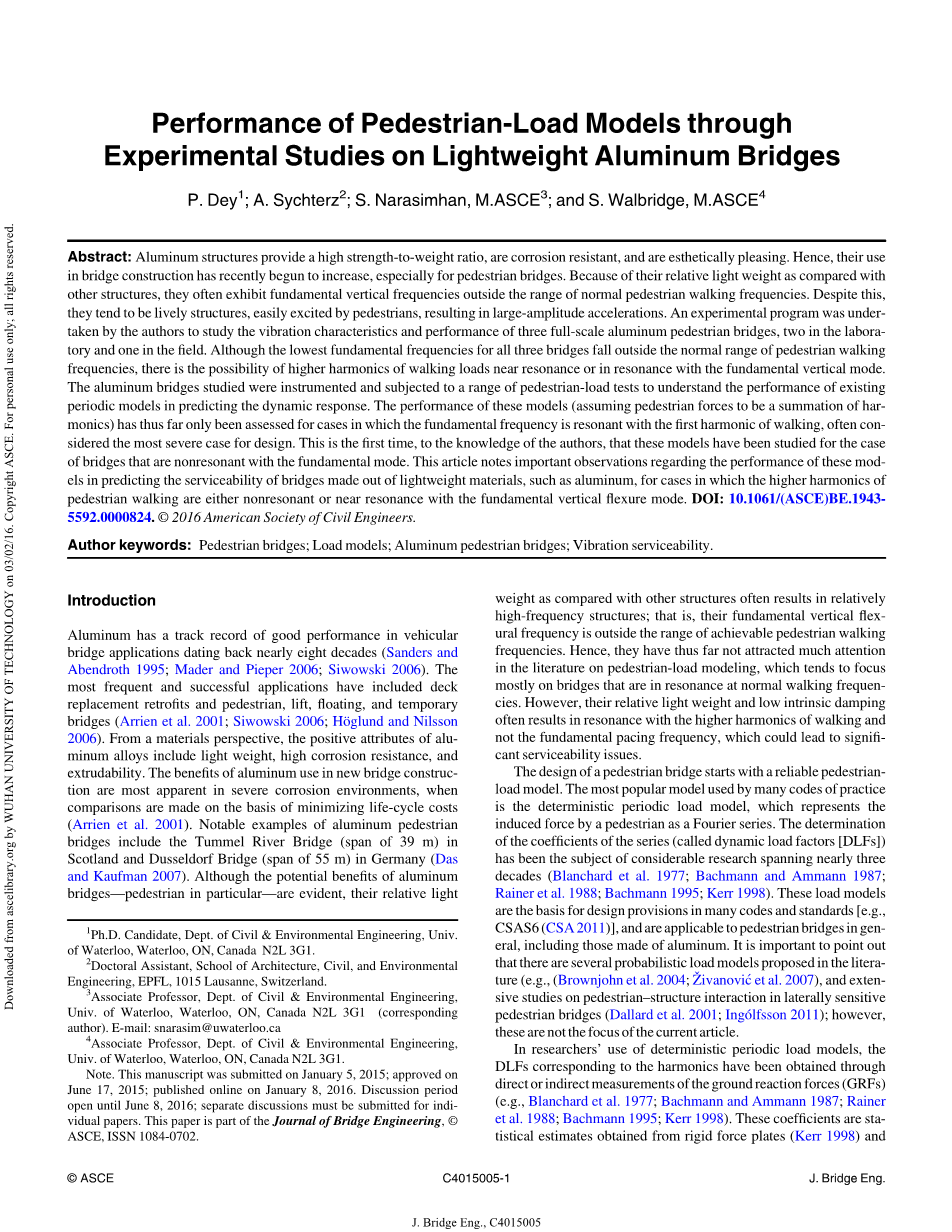 这篇文章的主要目标有两个,第一点对铝制桥的综合实验数据,即不显现出共振问题,但有重要的服务性问题作出一定的贡献,第二点,通过实例研究对规范与守则中的荷载模型进行一定的评估,就作者所知,这种评估是第一次被提出来,对于铝制桥来说尤其如此。对于三座全跨矮桁架桥的研究结果也被报道了出来。第一座焊接铝制桥全场44米,坐落在加拿大的魁北克省Brossard市,另外两座桥是模块化的铝制建筑。一座跨长12.2米,另一座为22.9米。滑铁卢大学的结构实验室对于这些桥在2014年的春天与秋天进行了测试。这篇文章报道并且讨论了单一人行荷载下的实验结果,包括了一系列项目和人行荷载频率以及总数为2145个的实验。首先一个简单地模型研究背景和响应模拟被提出。还有实验的细节以及场地项目实验。然后,几种荷载模型被进行了评估,通过比较预测和评估的结构对多种模型进行评估。