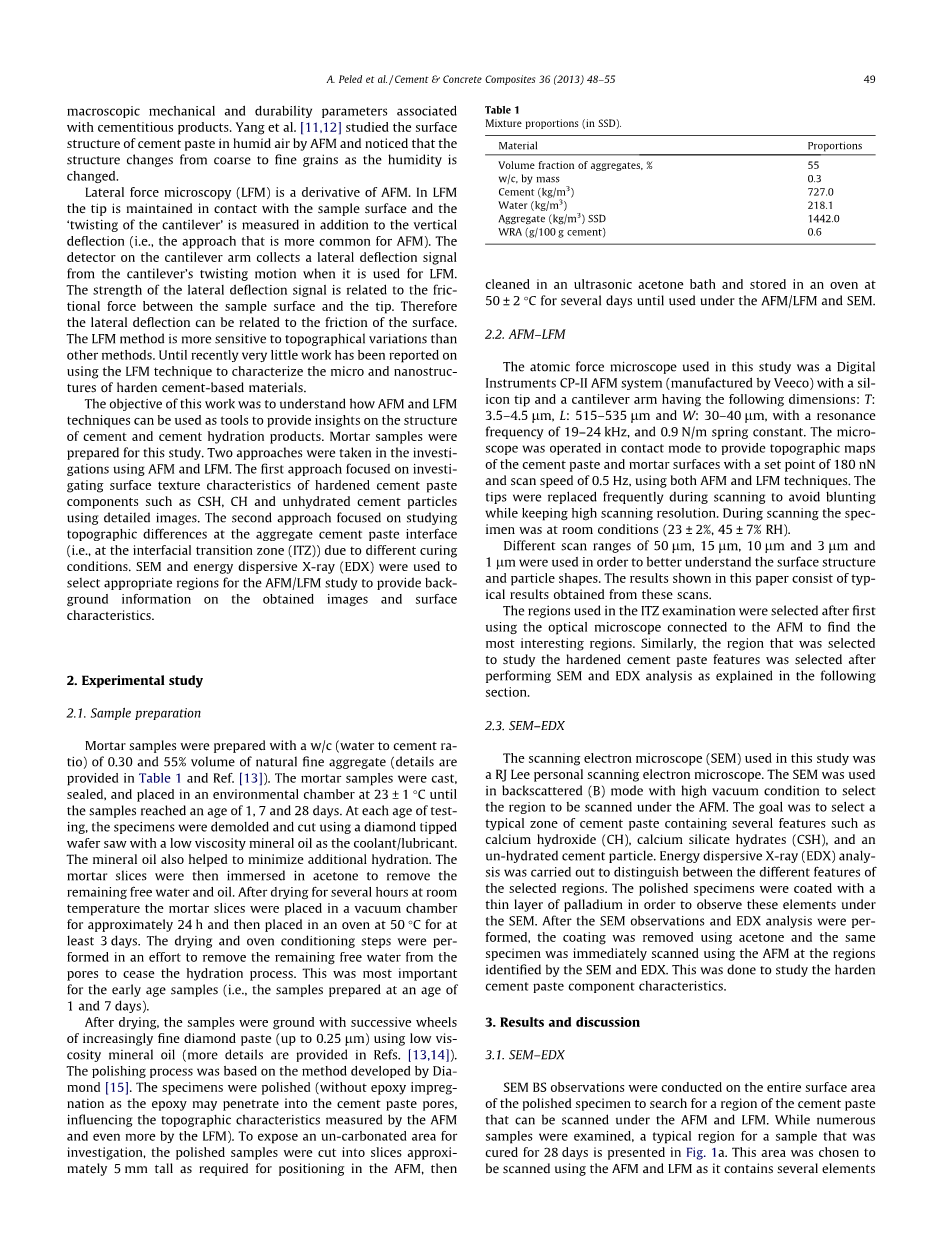 The objective of this work was to better understand how atomic force microscopy (AFM) and lateral force microscopy (LFM) techniques can be used as tools to understand the nanostructure and microstructure of cement and cement hydration products. AFM and LFM techniques were used on mortar samples to dis-tinguish between CSH, CH, and unhydrated cement particles. The LFM technique appears to be more sen-sitive to topographic changes than conventional AFM and it can more clearly distinguish between the different phases at high magnification (low scan range). AFM could also be used to calculate the rough-ness of the interfacial transition zone (ITZ) between aggregate and the cement paste at different ages. The rough surface at the interface of the paste and aggregate is generally interpreted as higher porosity. It was found that a reduction in roughness (i.e., porosity) occurred for samples that were cured for a longer time which are consistent with the explanation of porosity.