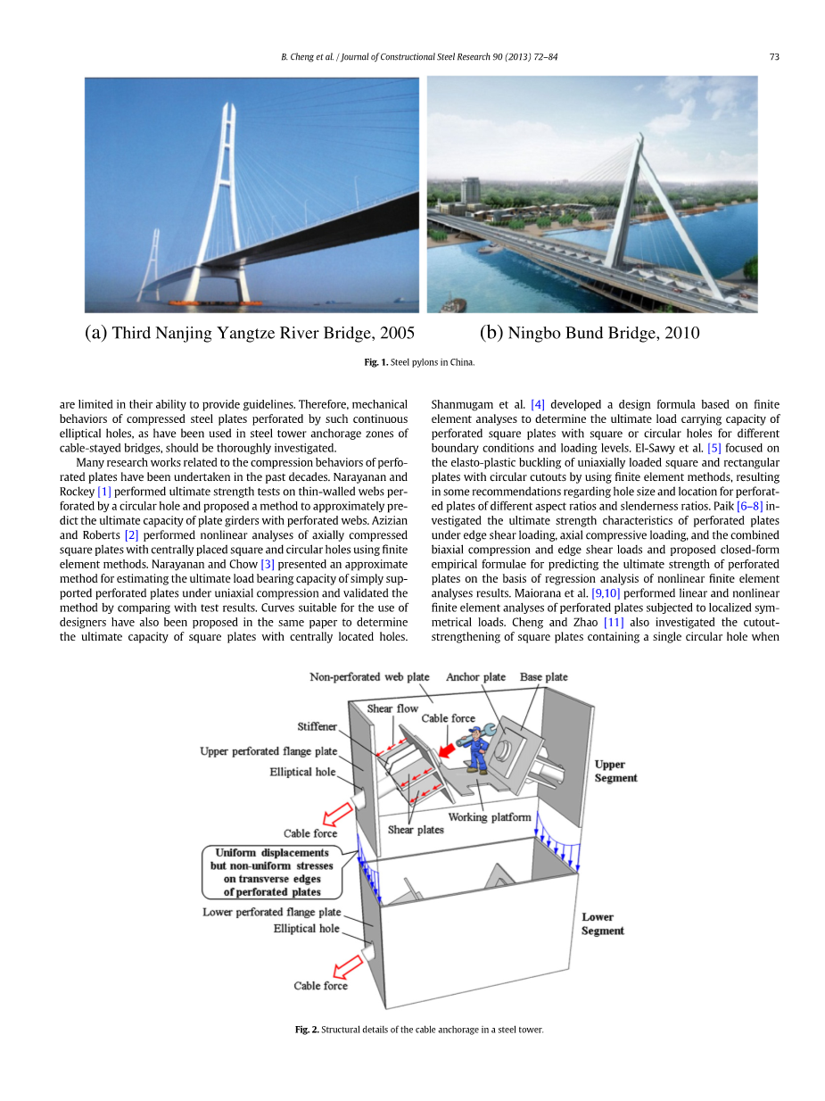许多关于穿孔板的压缩行为在过去的几十年里已经展开研究工作。Narayanan和Rockey [1]对薄壁圆孔冲孔网进行极限强度测试,提出了一种近似预测与穿孔板梁的极限容量网的方法。Azizian和罗伯茨[2]在轴向压缩广场上集中放置方形和圆形孔通过使用有限元素的方法进行非线性分析的。Narayanan和Chow[3]提出了一个近似方法估算极限荷载承载力,即简支穿孔板在单轴压缩和比较测试结果的方法。设计师在同一篇论文中也提出使用曲线来确定具有集中定位孔的方盘上的极限能力。Shanmugam等。[4]开发了一种基于有限的设计公式来分析确定多孔方形板与广场或圆形洞为不同边界条件和加载水平的最终负荷能力。El-Sawy等。[5]专注于单向地加载正方形和长方形的弹塑性屈曲板块与圆形图样,利用有限元方法,得到一些关于孔的大小和位置不同纵横比的穿孔板和长细比的建议。Paik(6 - 8)调查了穿孔板边缘剪切载荷作用下,轴向压缩载荷和总和双轴压缩和剪切载荷的极限强度特征,并提出封闭边缘经验公式预测穿孔的终极力量板的基础上回归的非线性有限元分析的结果。Maiorana等(9、10)进行线性和非线性穿孔板在局部对称负载的有限元分析。程和赵[11]也调查了包含一个圆孔的方形板在进行单轴压缩加载时的切口强度。一般来说,多孔板的压缩行为要考虑各种参数,包括板长宽比、长细比、孔形状、孔大小、孔位置,和负载条件下, 先前的研究已经全面调查,一些建议和配方有利于实际工程设计已提出。然而, 他们中没有一个人专注于不断把椭圆孔留在钢斜拉桥塔锚固区。