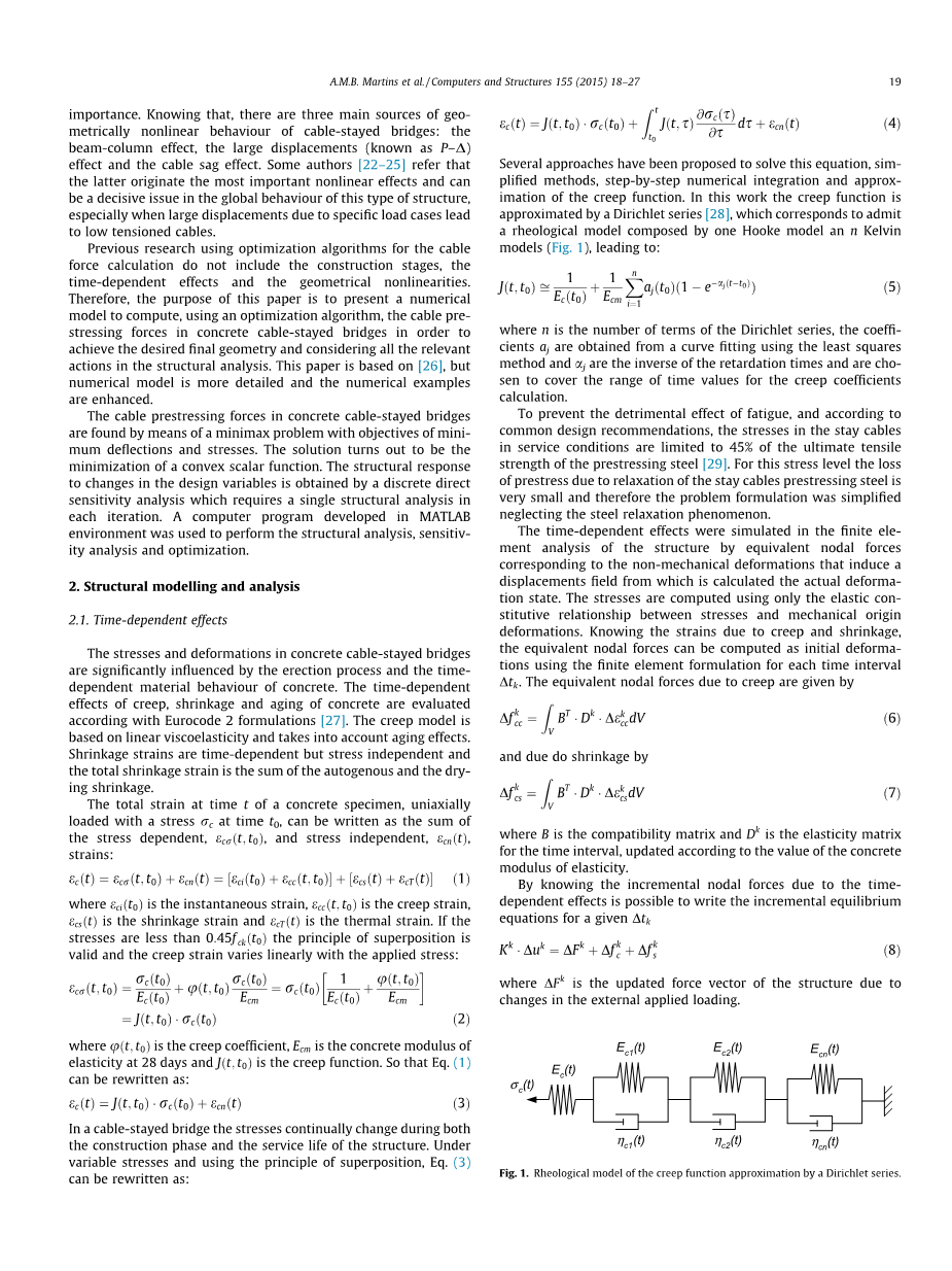安装过程和混凝土的时间依存性行为会显著影响混凝土斜拉桥的应力和变形。时间蠕变的影响,混凝土的收缩和老化评估符合欧洲规范。蠕变模型是基于线弹性的,同时考虑老化的影响。收缩徐变是时间依存性的,但是压力是独立的,同时总收缩徐变是自发收缩与干燥收缩之和。