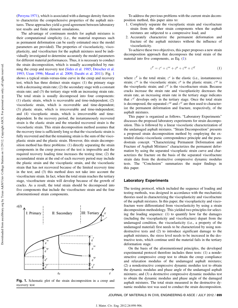 本文组织如下。“实验室实验”讨论了建议应变分解的实验室实验。这之后是线性粘弹性表征未损坏的沥青混合料。“应变分解”通过使用扩展的弹性粘弹性对应原理和伪应变概念呈现提出应变分解方法。“定性永久变形和沥青混合料的“断裂,通过使用分离的粘塑性应变曲线表征的永久变形同时表征分离的粘弹性断裂的基础上破坏性压缩动态模量实验应变数据。“结论”总结了本文主要研究结果。
