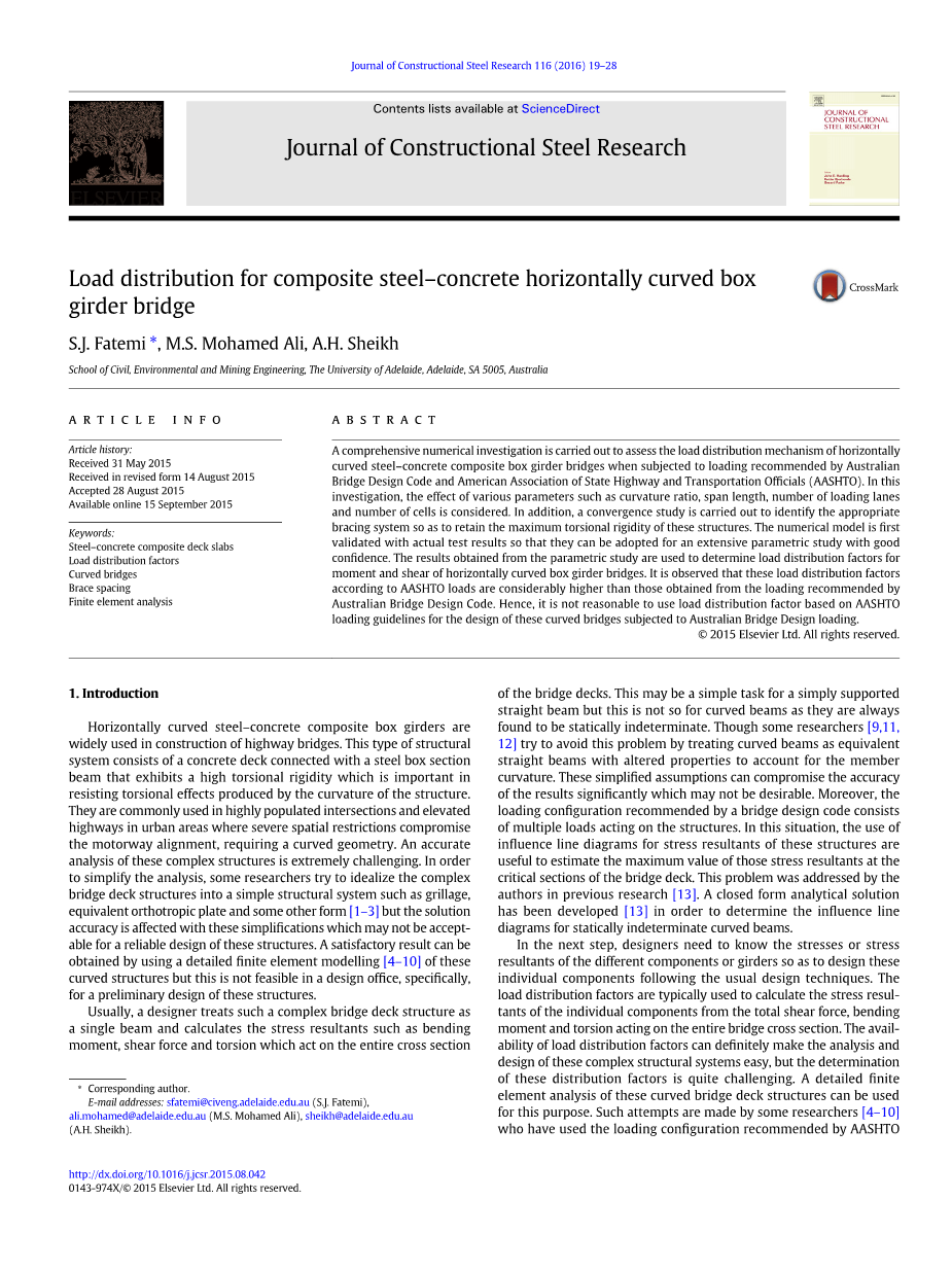 在澳大利亚桥梁设计规范和美国国有公路运输管理员协会(AASHTO)的推荐下,针对荷载作用下的钢-混凝土组合箱梁桥的水平曲线的荷载分配机理,进行了数值模拟研究。在本次研究中,考虑了诸多影响因素,诸如:曲率比、跨度长度、加载车道数和单元数;此外,为了保持这些结构的最大扭转刚度,进行了收敛性研究,以确定适当的支撑系统。数值模型首先验证实际测试结果,使他们对采用广泛的参数研究具有良好的信心。参数研究的结果被用来确定水平曲线箱梁桥的弯矩和剪力荷载分配系数。据研究,根据AASHTO得到的这些载荷分布因子比由澳大利亚桥梁设计规范推荐的载荷分布因子高得多。这是不合理的使用基于AASHTO载荷分布系数。