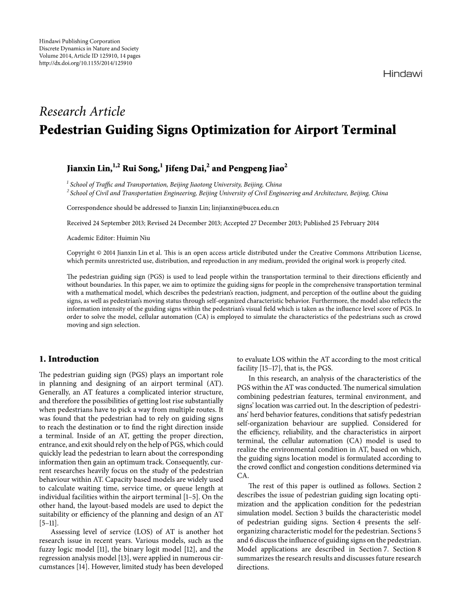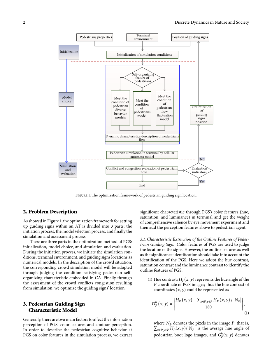 本文剩下的内容概述如下。第2部分描述了行人仿真模型中的行人引导标识设置地点优化和运用条件的问题。第3部分建立了行人引导标识的特征模型。第4部分展示了行人的自组织特征模型。第5和第6部分讨论了引导标识对行人的影响。模型的运用在第7部分进行了描述。第8部分总结了研究成果并讨论了未来的研究方向。