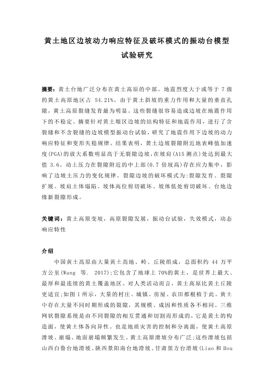 黄土地区边坡动力响应特征及破坏模式的振动台模型 试验研究外文翻译资料
