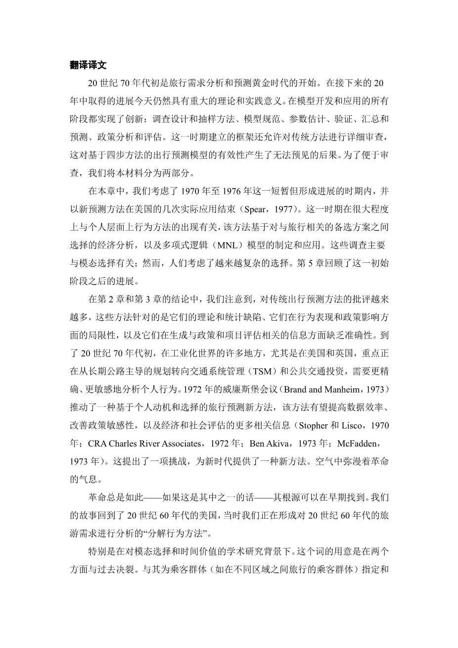 The early 1970s was the beginning of a golden age for travel demand analysis and forecasting. Progress made in the following two decades still has major theoretical and practical relevance today. Innovations were achieved in all phases of model development and application: survey design and sampling methods, model specification, parameter estimation, validation, aggregation, and forecasting, policy analysis and evalu ation. The framework established in this period also allowed traditional methods to be subjected to detailed scrutiny, which had quite unforeseen consequences for the validity of travel forecasting models based on the four-step approach. For the purposes of our review,we divide this material into two parts.