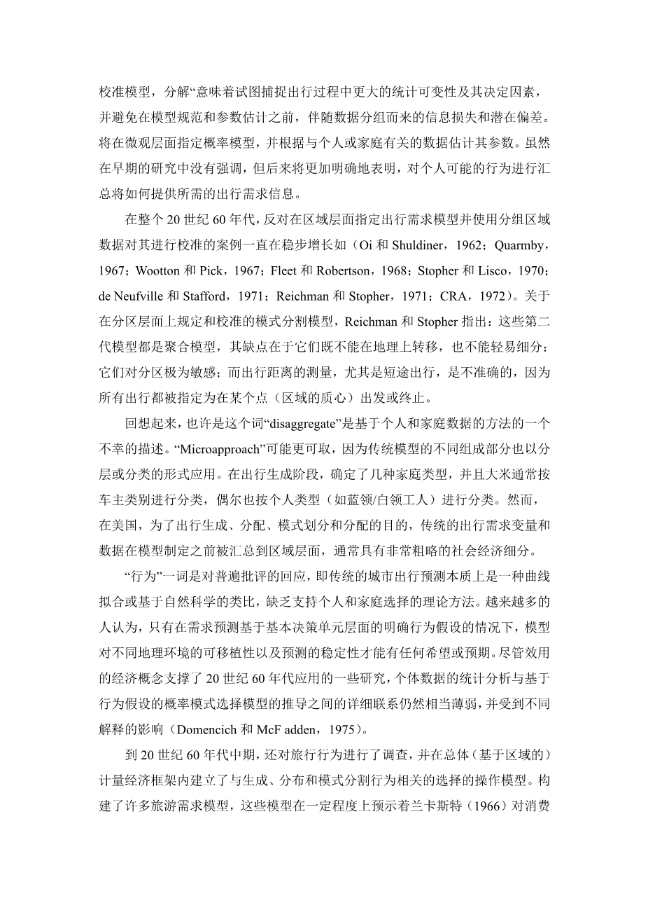 The case against specifying travel demand models at the level of the zone and calibrating them with grouped zonal data had been growing steadily through the 1960s (Oi and Shuldiner, 1962; Quarmby, 1967; Wootton and Pick, 1967; Fleet and Robertson, 1968; Stopher and Lisco, 1970; de Neufville and Stafford, 1971; Reichman and Stopher, 1971; CRA, 1972). In relation to modal split models, specified and calibrated at the zonal level, Reichman and Stopher were to remark: these second generation models are all aggregate models and have drawbacks in that they can neither be transferred geographically nor readily subdivided: they are extremely sensitive to zoning; and the measurements of trip distances, particularly for short trips, are inaccurate because of the aggregation under which all trips are designated as originating or terminating at a point, the centroid of a zone (Reichman and Stopher, 1971,92 -93).