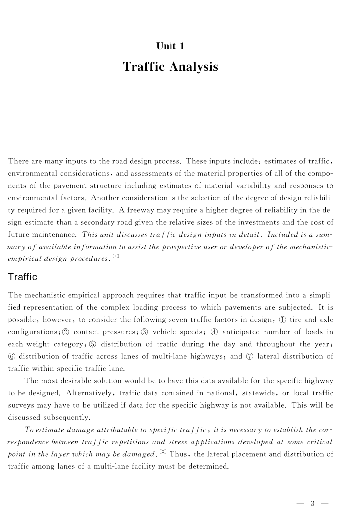 道路设计过程中有很多投入,这些投入包括:对交通的估计,环境方面的考虑,对路面结构所有成分的材料属性的评价,其中包括材料的变化性和对环境的反应。另外一方面的考虑是对给定设施的设计可靠性程度的选择。在于投资和未来养护方面费用差不多的二级公路相比较时,高速公路可能在设计评估时需要一个更高的可靠性程度。这一单元具体讨论与交通相关的设计参数。其中包括对未来用户和力学经验中路面程序开发者的有用信息。