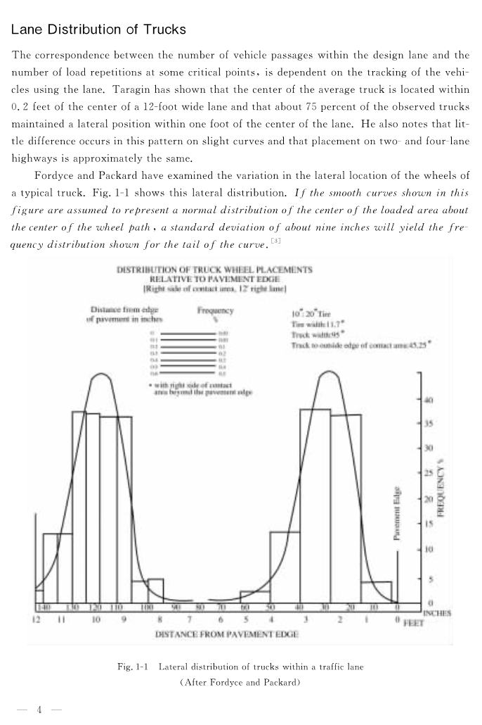设计线路内的车辆通道数与一些临界点负荷重复数的一致性取决于车辆在行驶道路上的轨迹。Taragin指出平均车中心坐落在与12英尺宽的车道中心的0.2英尺距离以内,所观测到的货车有百分之七十五保持在车道中心的一英尺内的横向距离。他还指出这种模式下在细曲线上会发生较小的差异,而双车道或四车道与这种模式大致相同。