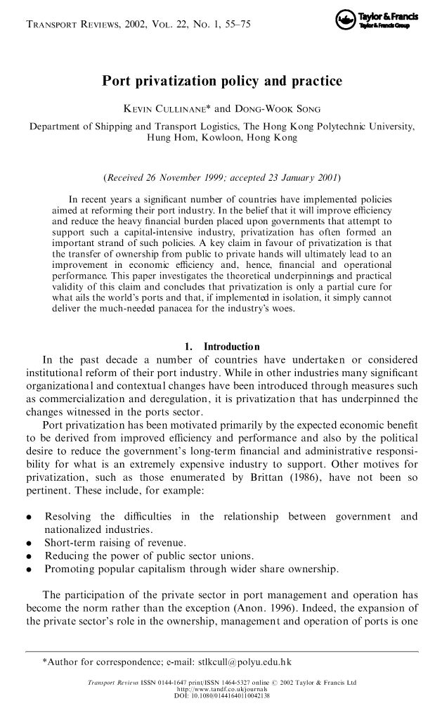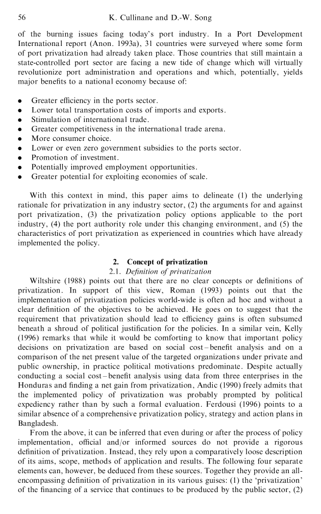 有了这方面的背景下,本文旨在划定(1)任何行业领域私有化的基本理论,和(2)对港口私有化的观点,(3)适用于港口私有化的政策选择,(4)在这个不断变化的环境下,港口当局的作用,以及(5)在已经有实行该政策经历的国家内港口私有化的特点。