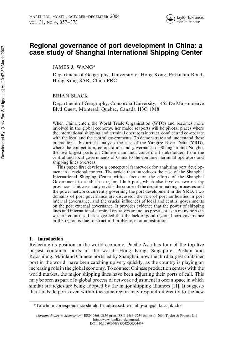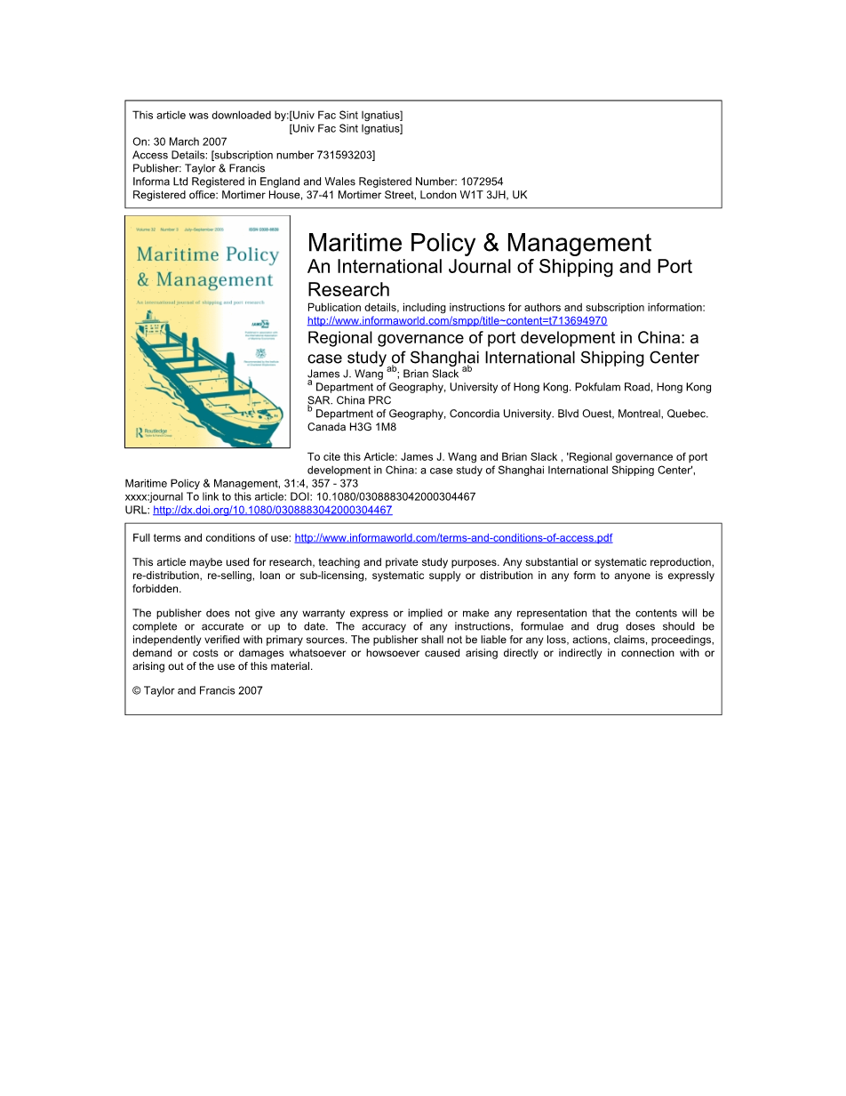 在中国地区港口发展的治理:一个上海国际航运中心的案例研究詹姆斯·j·王ab布莱恩松弛香港大学地理系,。Pokfulam路,香港中国中华人民共和国特别行政区。b地理系,康科迪亚大学。大马路西部省,蒙特利尔,魁北克。加拿大H3G 1 m8本文引用:詹姆斯·j . Wang和布莱恩松弛,港口的区域治理开发在中国:一个案例研究上海国际航运中心”,海洋政策与管理、31:4 357 - 373