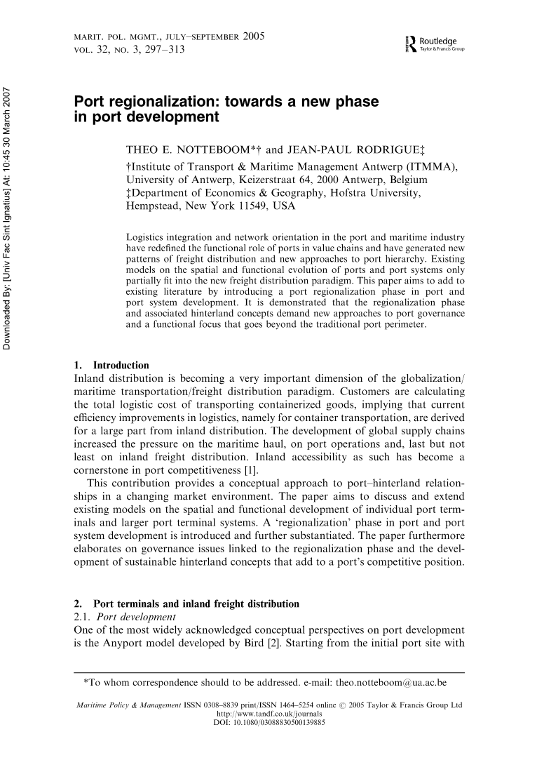 港口与航运业的物流整合与网络定位重新定义了港口在价值链中的功能作用,并产生了货物配送的新模型和港口层次的新方法。现有的港口和港口系统的空间和功能演化模型只适合于新的货运模式。本文旨在通过引入港口区域化阶段的港口和港口系统的发展来增加现有文献内容。它表明,区域化阶段和相关的腹地概念需要新的方法来进行港口管理和超越了传统的港口周边的实用性中心。