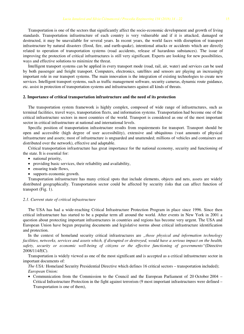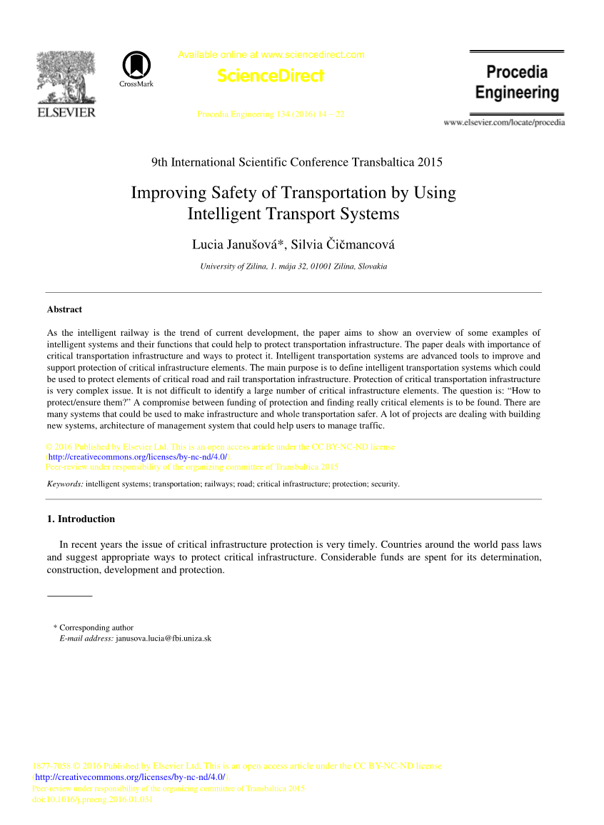 交通运输是影响社会经济发展和生活水平增长的重要部门之一。每个国家的交通基础设施十分脆弱,如果受到攻击,损坏或破坏,它可能会失去利用价值好几年。近年来,世界面临着交通基础设施被破坏的自然灾害(洪水,火灾,和地球地震),故意攻击或事故,这直接关系到交通运输系统的运作(道路交通事故,危险物质的泄露)。提高关键基础设施保护的问题仍然非常重要。专家正在寻找新的可能性,方法和有效的解决方案,以减少威胁。