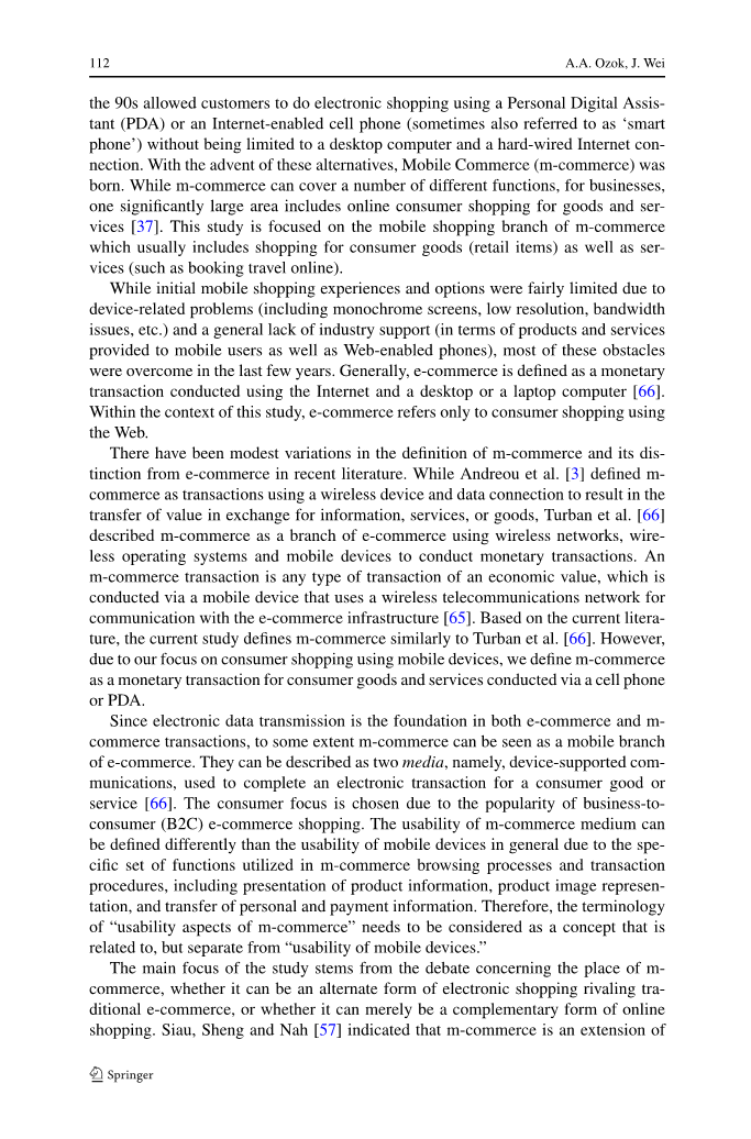 自1994年以来,电子商务成为了一个领域,其中可用性成为了影响购物网页设计的一个重要的角色。对网络功能的移动设备在90年代末引入,允许客户进行电子购物,使用个人数字助理(PDA)或因特网智能的蜂窝电话(有时也被称为“智能电话),而不限于台式计算机和一个硬连线的互联网连接。随着这些的出现,移动电子商务诞生了。而移动电子商务可以覆盖许多不同的功能,对企业来说,一是更大领域扩展包括网上消费者购物的商品和服务。这项研究是专注于移动商务的手机购物的分支,它通常包括消费品的购物(零售项目)以及服务(比如旅游在线预订)。