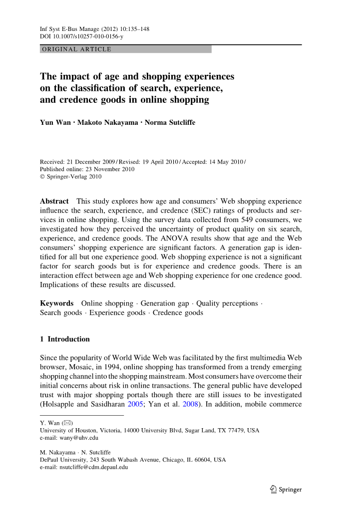 Online shopping Generation gap Quality perceptions Search goods Experience goods Credence goods