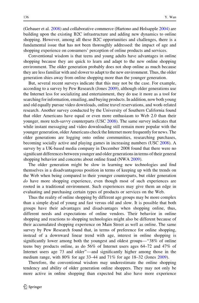 在1994年,网上购物已经从个时髦的新兴的购物频道转化成购物的主流,这是由于第一个多媒体网站浏览器Mosaic为万维网的普及提供了便利。大多数消费者已经克服了最初对网上交易风险的担忧。尽管有些问题仍待调查,但是广大民众已经与各大购物门户网站取得相互信任(霍尔萨普尔、萨丝德汗安,2005;燕等,2008)。除此之外,移动商务(葛鲍尔,2008)和协同商务(托诺、霍尔萨普尔,2004)都是建立于现有的B2C技术设施的网上购物。然而,在所有这些B2C的机遇和挑战中有一个基本问题没有得到解决:年龄和购物体验对消费者感知的在线产品和服务的影响。传统观念认为,青少年和年轻的成年人在网上购物上有优势,因为他们能快速学习和适应网上购物的新环境。老一代可能没有年轻人在网上购物那么频繁,因为他们对网购不太熟悉,并且不能很快适应新环境。因此,老一代比年轻一代更容易回避网上购物。但是,最近几个调查表明,事实可能不是这样的。例如,更具皮尤的调查(2009年琼斯),虽然老一辈很少使用互联网进行社交和娱乐,他们更多的是把它作为一种搜索信息、收发电子邮件和购买产品的工具。此外,现在的老年人和年轻人一样都有视频下载,在线旅游预订和搜索工作相关的资料的诉求。南加州大学的另一项调查表明,相比于年轻的美国人来说,年长的美国人有同等的甚至更大的热情使用Web2.0 ,更夸张的是这个领域还有更多的专家(USC2008)。同样的调查表明,虽然即时信息和视频下载仍然更受年轻人欢迎,可是年长的美国人相对于年轻人来说能够更熟练地上网查新闻。越来越多年长的美国人都乐于活跃的参加在线社区的射线活动、玩网络游戏(USC2008)。一家总部设在英国的媒体在2008年12月所做的一项调查发现,一般来说,年轻人和年长的人对于网络购物和在线欺诈的关注并无明显的差别。(NWA2009)