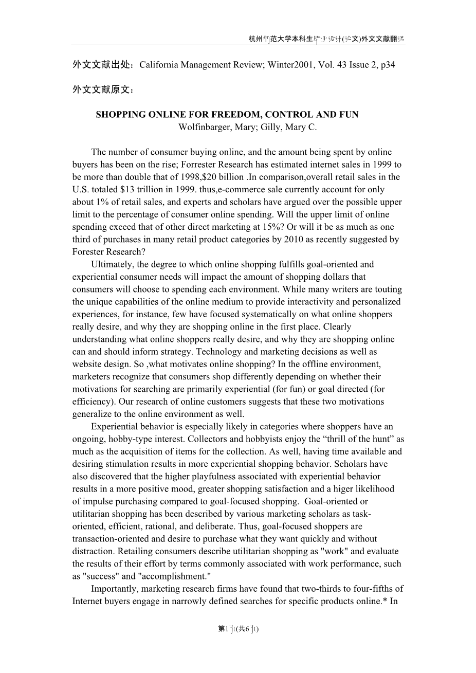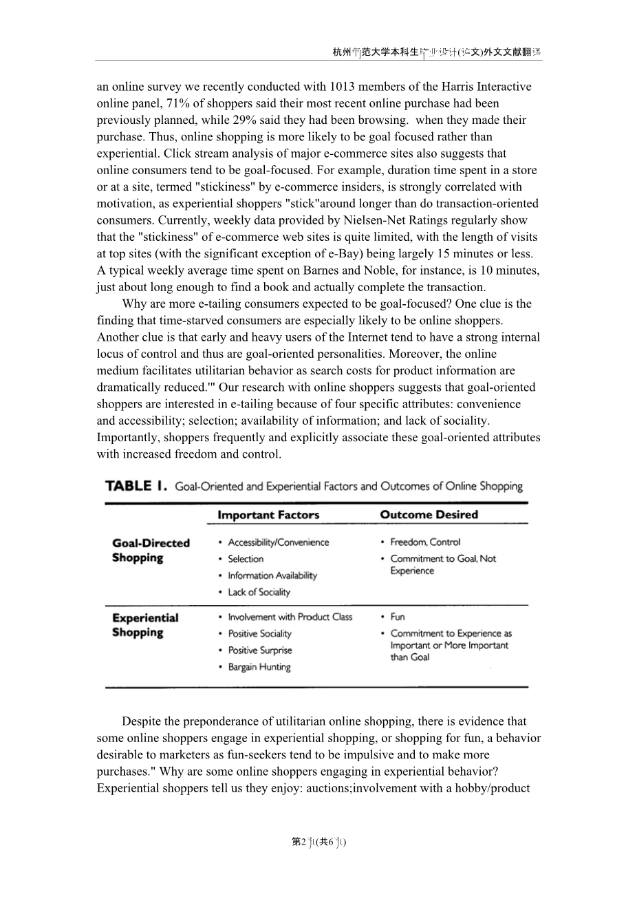 为什么更多的电子零售消费者期望专注于目标?一个线索发现,时间缺乏的消费者特别可能成为网上购物者。另一个线索是早气的重量级互联网用户有强烈的每部控制倾向,并因此是目标导向的人士。此外,在线媒体随着产品信息搜索成本的显著减少而促进功利行为。我们的在线购物者的研究表明,目标导向的购物者对电子零售感兴趣是因为其4个特殊的属性:(1)便利无障碍(2)可挑剔(3)信息的实用(4)无社交。重要的是,消费者往往并明确的将这些以目标为导向的属性于更多兹有和控制联系起来。