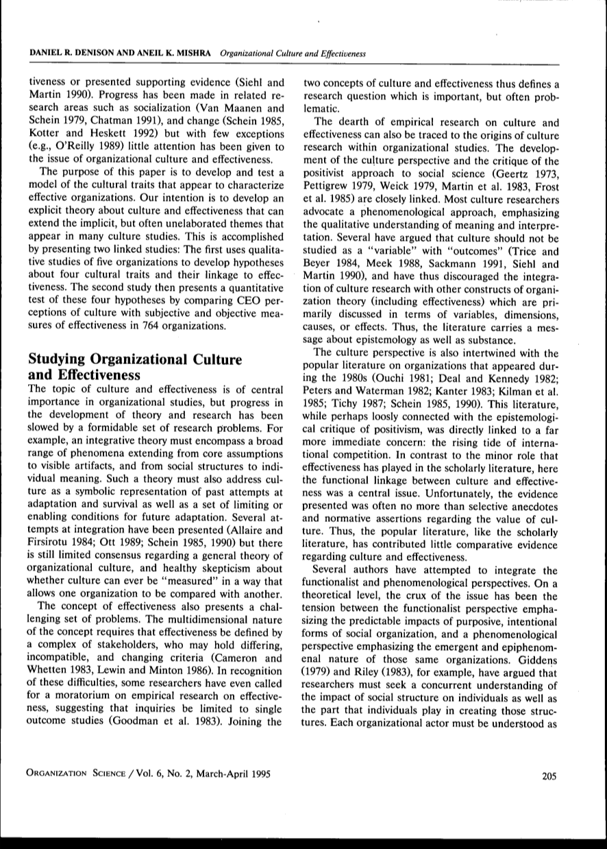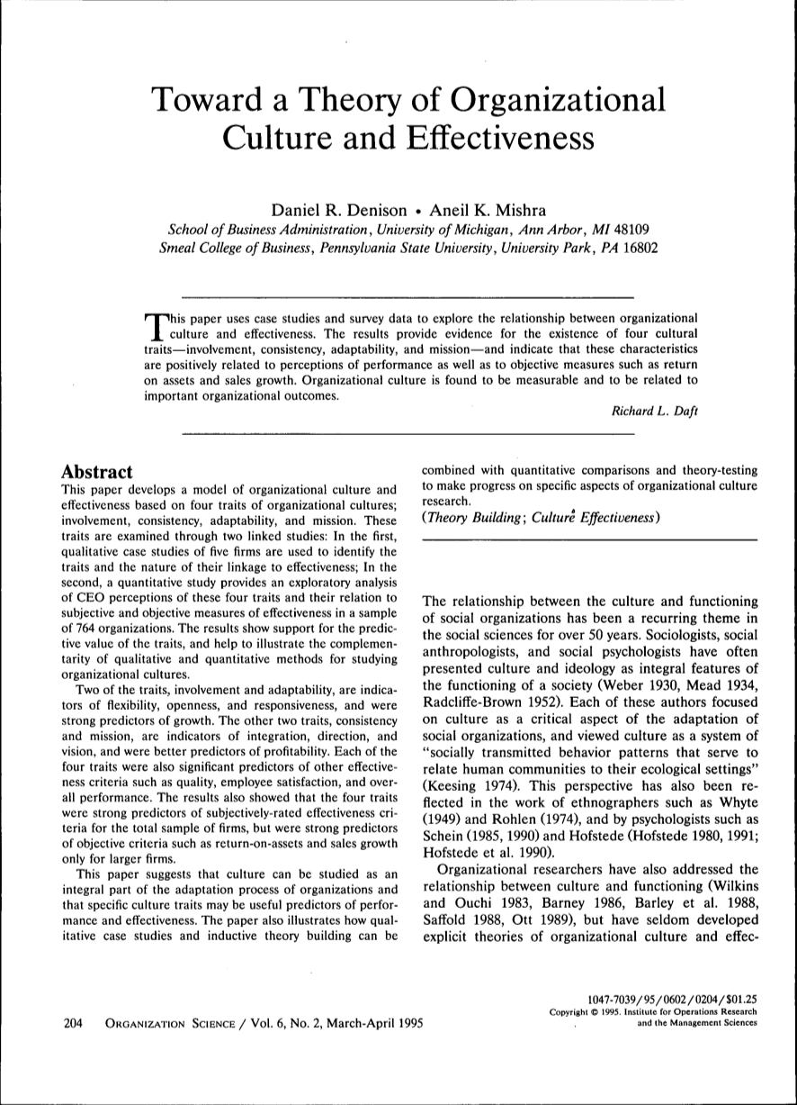 This paper develops a model of organizational culture and effectiveness based on four traits of organizational cultures; involvement, consistency, adaptability, and mission. These traits are examined through two linked studies: In the first, qualitative case studies of five firms are used to identify the traits and the nature of their linkage to effectiveness; In the second, a quantitative study provides an exploratory analysis of CEO perceptions of these four traits and their relation to subjective and objective measures of effectiveness in a sample of 764 organizations. The results show support for the predictive value of the traits, and help to illustrate the complementarity of qualitative and quantitative methods for studying organizational cultures.