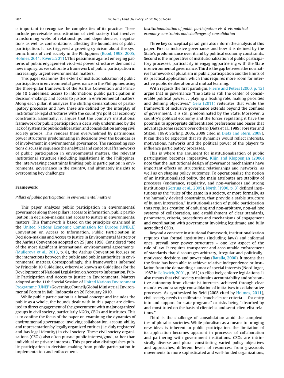 摘要:本文概述了菲律宾公众参与环境治理的制度化进程,采用了“奥胡斯公约”和“准则”的三个支柱框架:信息获取,公众参与决策和环境诉诸司法事项。分析了如何通过制度 - 法律结构与国家政治经济约束的相互作用来界定这些界限。虽然该国似乎有一个强有力的公共参与制度设计,但实际参与过程的制度化程度较低,无法从权力结构中实现实质性自治,这限制了与政府机构的交往性,连贯性和必要的合法性。虽然多元化是公众参与的一个关键原则,但菲律宾的情况表明其适用的局限性,特别是在一个世袭政治背景下,在了解了公共利益的复杂性中,这种弱点使得特定利益占主导地位,取代了其他合法的群体