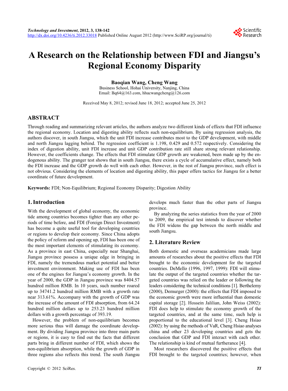 外商直接投资与江苏区域经济差距的关系研究外文翻译资料