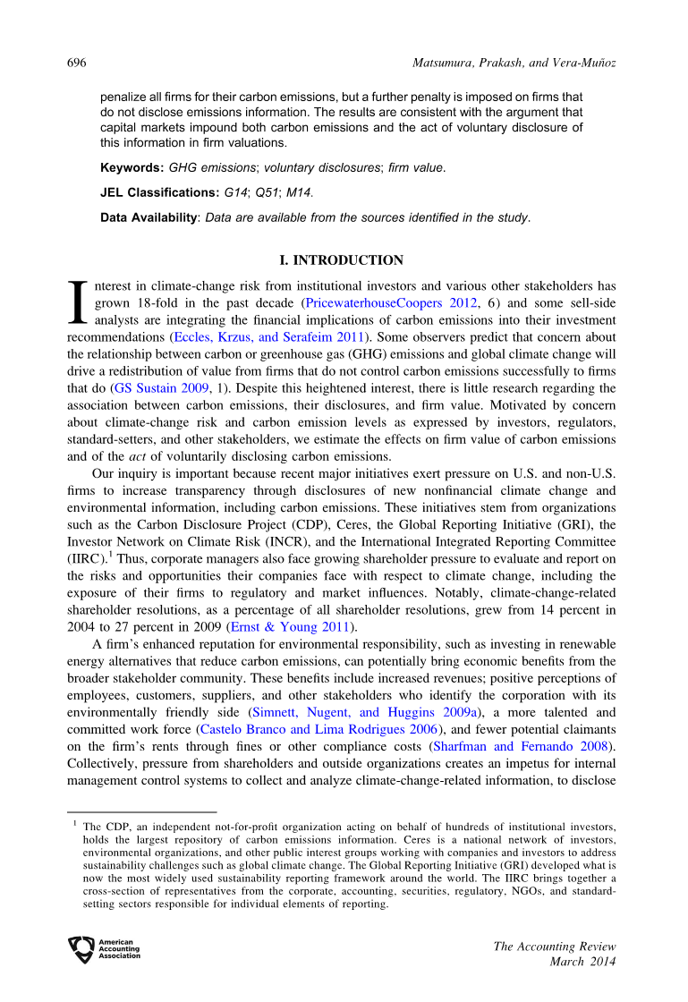 在过去的十年,机构投资者和各种其他利益相关者对气候变化风险的兴趣增加了18倍(PricewaterhouseCoopers 2012, 6)一些卖方分析师整合碳排放的财政数据提供建议影响他们的投资(Eccles, Krzus, and Serafeim 2011)。一些观察家预测对温室气体(GHG)排放与全球气候变化之间的关系问题的关注的论点将从公司绩效无影响成功转变到公司绩效有影响(GS Sustain 2009, 1。尽管对该论点的研究兴趣不断升高,依然存在少量研究忽略碳排放量,其披露,与公司绩效之间的关联。受投资者,监管者,标准制定者和其他利益相关者对气候变化风险和碳排放水平关注的启发,我们预估企业绩效对碳排放与自愿披露碳排放的行为的影响。