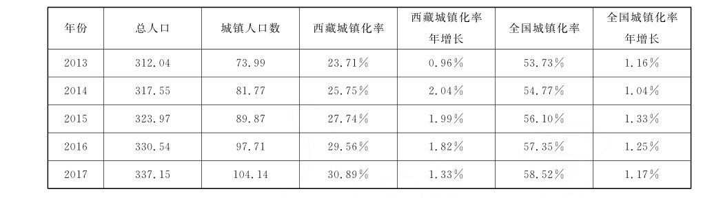 表一2013年-2017年西藏自治区及全城镇化率水平[2]