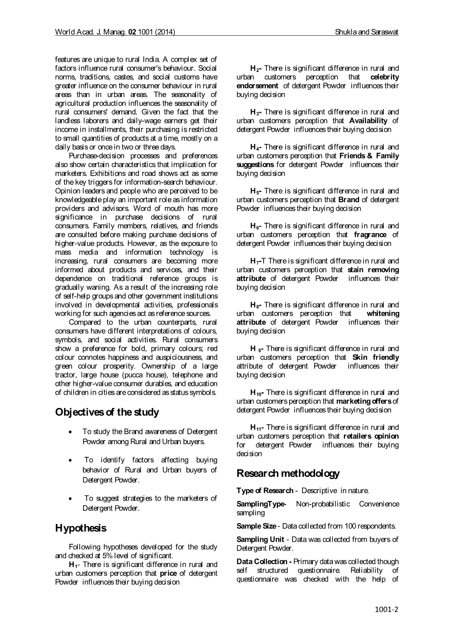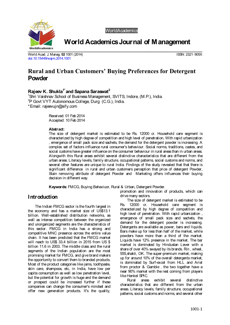 摘要:洗衣粉的市场规模大约为12000千万印度卢比。家庭护理环节具有高度的竞争性和较高的渗透性。随着城市化进程的加快,小包装尺寸和小袋出现,使得洗衣粉的需求量也在不断增加。一系列复杂因素都影响着农村消费者的行为,其中社会规范、传统文化、种姓和社会习俗对农村地区消费者行为的影响力比城市地区更大。与此同时,农村地区也呈现出不同于城市的特色。文化水平、家庭结构、职业模式、社会习俗和规范以及其他一些特征都是印度农村特有的。研究结果表明,在农村和城市消费者的感知中,洗衣粉的价格、洗衣粉的去污效果和营销的价格对他们的购买决策有不同的影响。