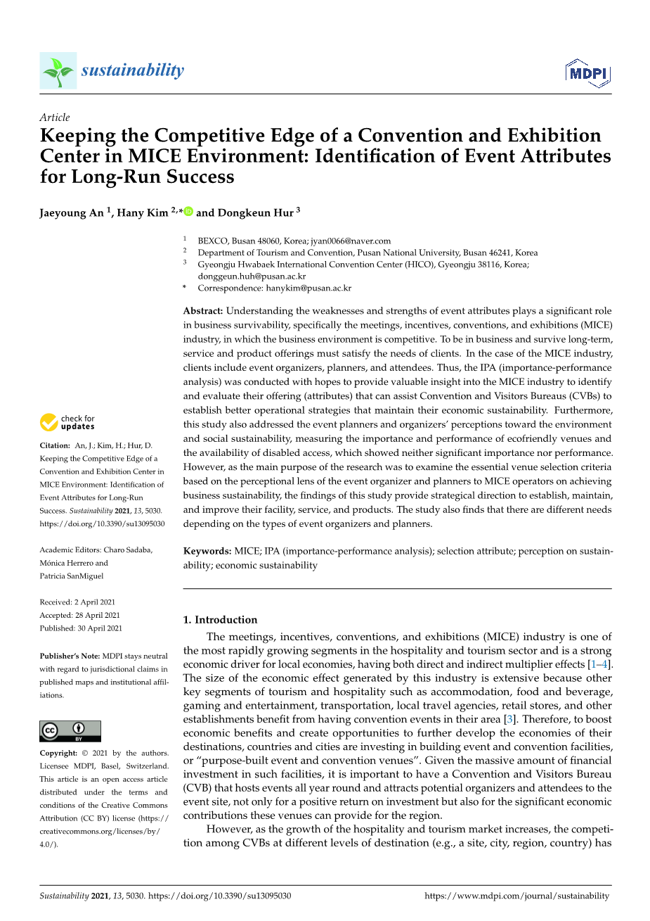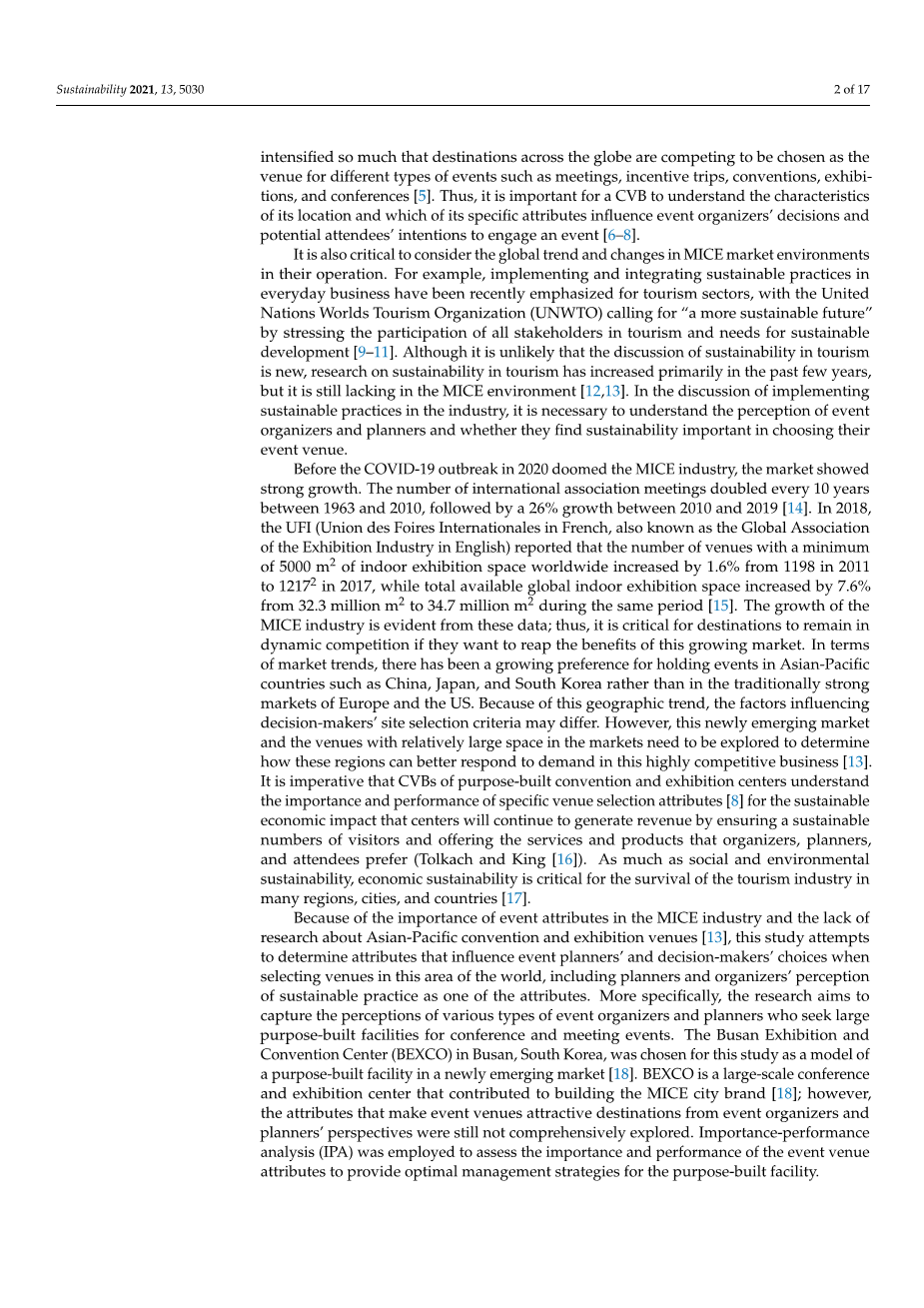 在2020年COVID-19爆发之前,MICE行业注定,市场呈现强劲增长。1963年至2010年期间,国际协会会议的数量每10年翻一番,随后在2010年至2019年期间增长了26%[14]。2018年,UFI(法语为Union des Foires Internationales,英语也称为全球展览业协会)报告称,场地数量至少为5000米2全球室内展览空间从2011年的1198个增加到1217个,增长了1.6"017年,全球室内展览总面积从3230万平方米增长7.6%2至 3470 万米2在同一时期[15]。从这些数据中可以明显看出MICE行业的增长;因此,如果目的地想要从这个不断增长的市场中获益,那么保持动态竞争至关重要。就市场趋势而言,人们越来越倾向于在中国、日本和韩国等亚太国家举办活动,而不是在传统上强大的欧洲和美国市场举办活动。由于这种地理趋势,影响决策者选址标准的因素可能有所不同。然而,这个新兴市场和市场中空间相对较大的场馆需要探索,以确定这些地区如何更好地响应这个竞争激烈的业务的需求[13]。专用会议和展览中心的CVB必须了解特定场地选择属性的重要性和性能[8],以便通过确保可持续的访客数量并提供组织者,规划者和与会者喜欢的服务和产品,中心将继续产生收入的可持续经济影响(Tolkach和King[16]]).与社会和环境可持续性一样,经济可持续性对于许多地区、城市和国家旅游业的生存至关重要[17]。