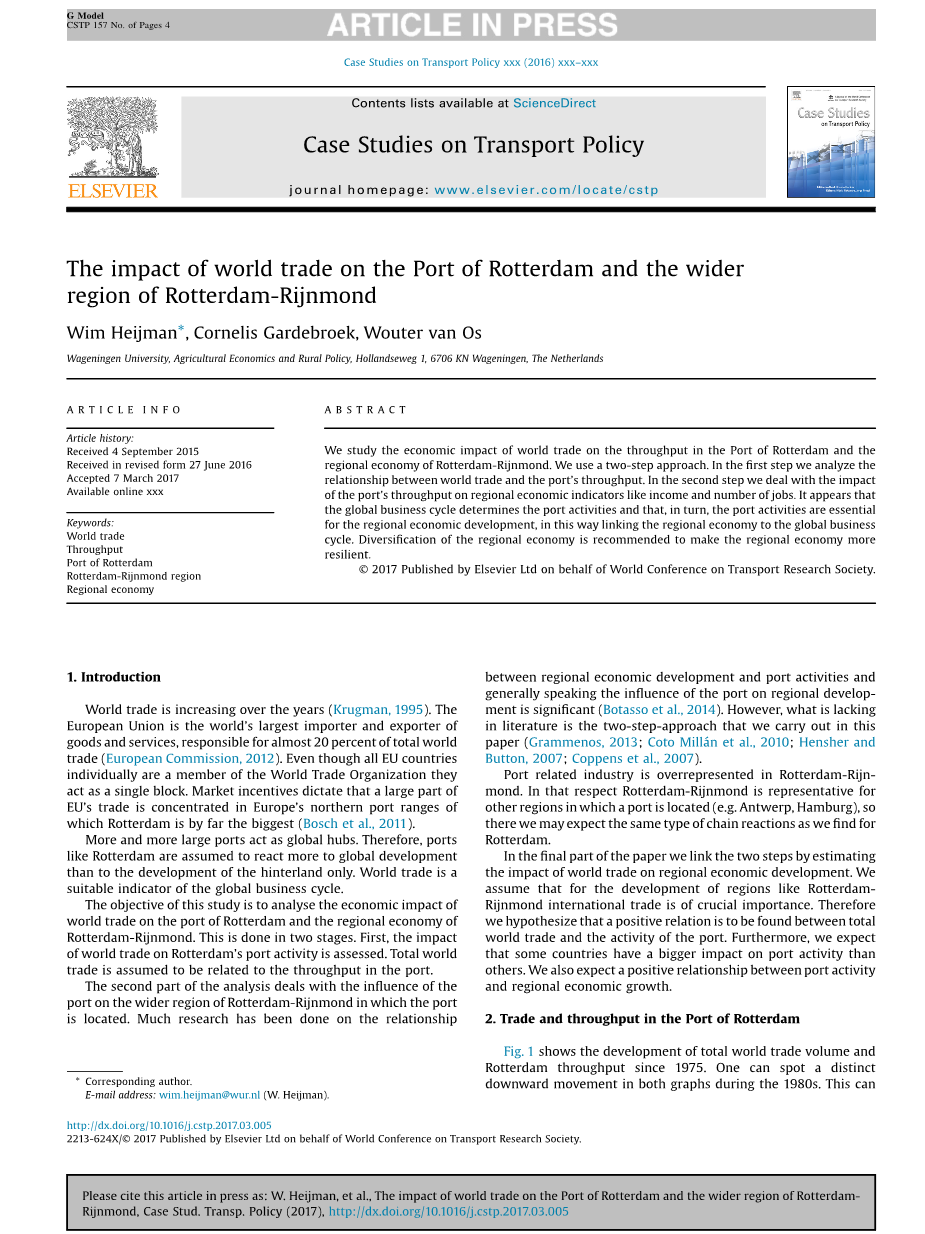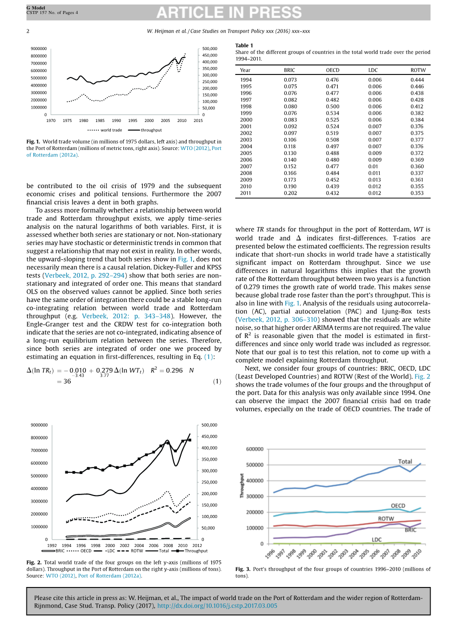 本文研究的目的是分析世界贸易对鹿特丹港和地区的经济影响。鹿特丹-莱茵蒙德的区域经济。这将分两个阶段进行。首先,世界贸易的影响评估世界贸易对鹿特丹港口活动的影响。世界贸易总额与港口的吞吐量有关。