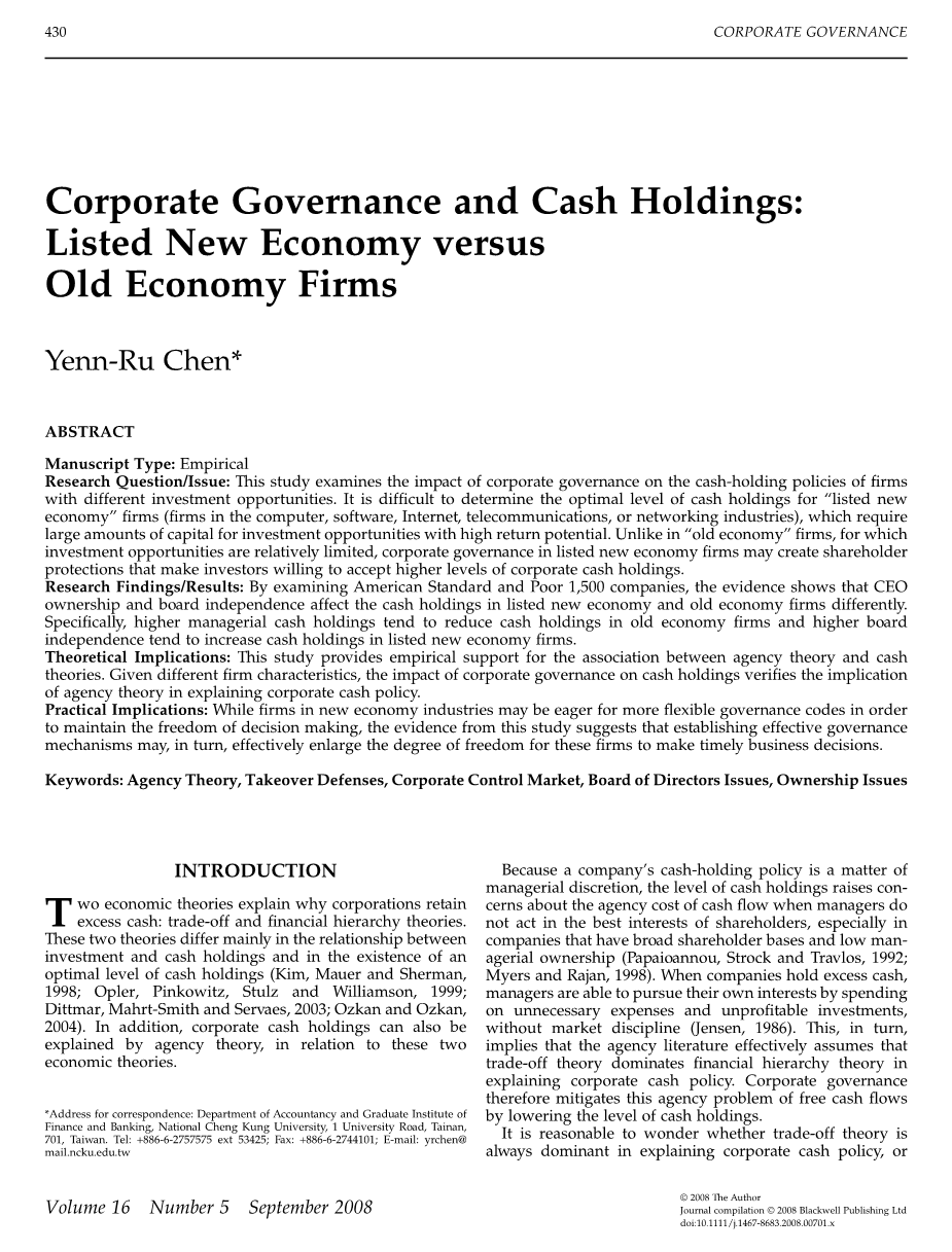 公司治理与现金持有: 上市的新经济公司与老经济公司外文翻译资料