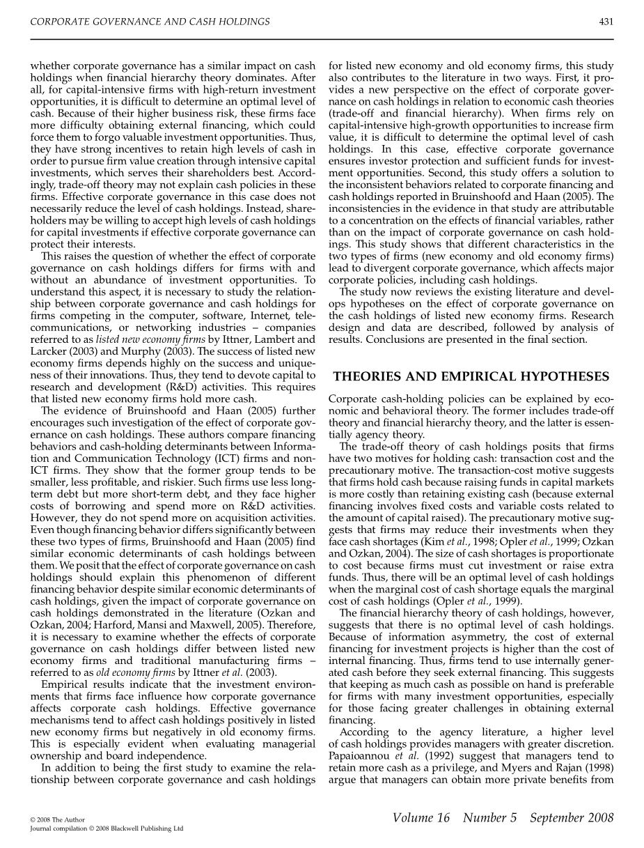 Bruinshoofd和Haan (2005)的证据进一步鼓励了公司治理对现金持有的影响调查。这些作者比较了信息和通信技术 (ICT)企业与非信息技术企业间的融资行为和现金持有决定因素。结果表明,前者偏好规模更小,利润更少,风险更大。同时这些公司不是使用更少的长期债务,而是使用更多的是短期债务,并且他们也面临着更高的借贷成本和更多的Ramp;D活动花费。但是,他们却并没有在收购活动上花费更多的钱。尽管这两类公司之间的融资行为存在显著差异,Bruinshoofd和Haan (2005)在它们之间找到了相似的现金持有的经济决定因素。鉴于公司治理对现金持有的影响已经在文献中得到证明,尽管现金持有量的经济决定因素相似,我们仍假设公司治理对现金持有量的影响应该解释这种不同的融资行为现象 (Ozkan 和Ozkan,2004;Harford,Mansi和Maxwell,2005)。因此,我们有必要研究公司治理对现金持有的影响是否存在于新经济上市公司和传统制造业公司—被Ittner et al.(2003)描述为“老经济公司”之间。