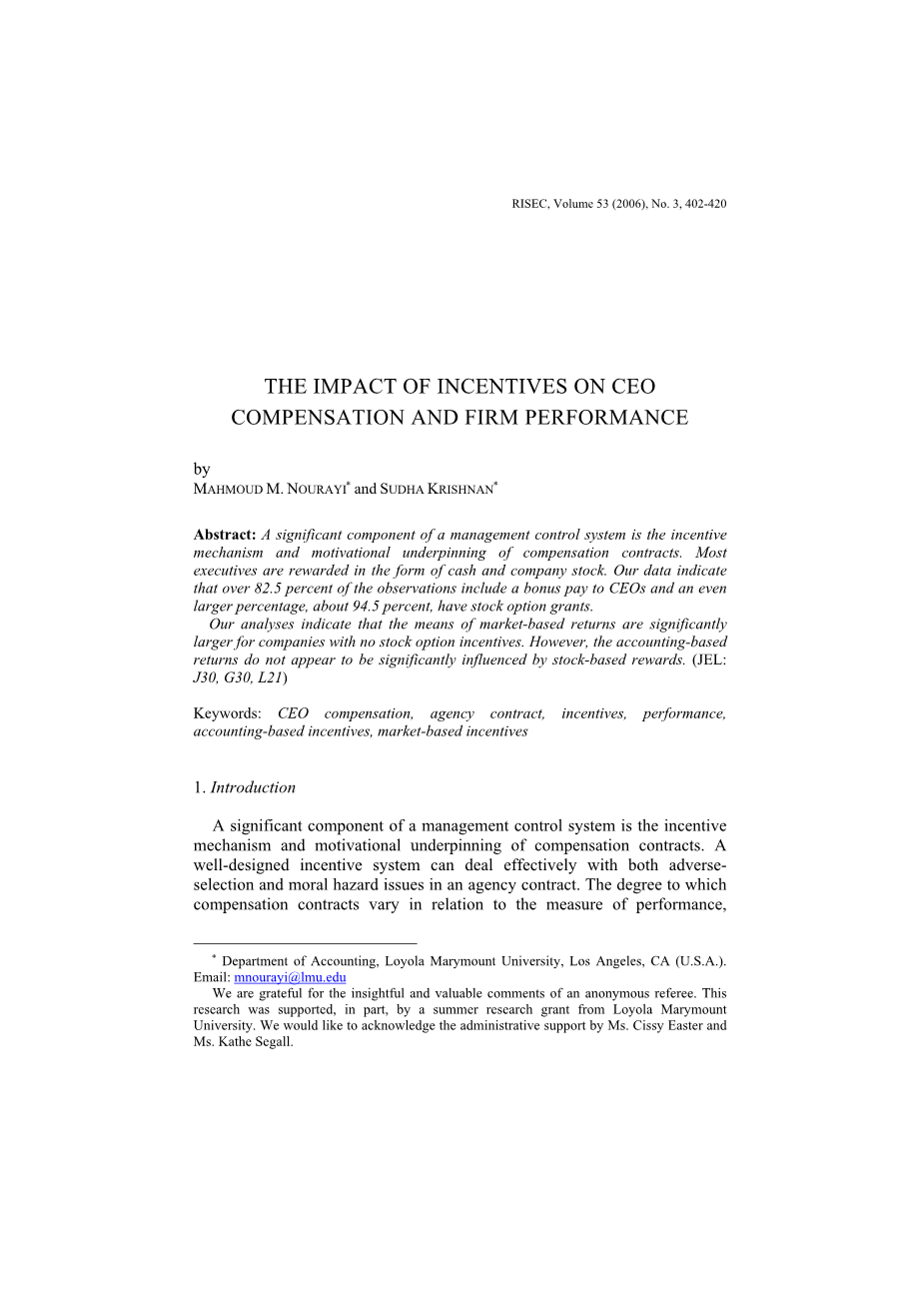 关键词:CEO薪酬,代理合同,激励、表现,以会计为基础的激励,以市场为基础的激励