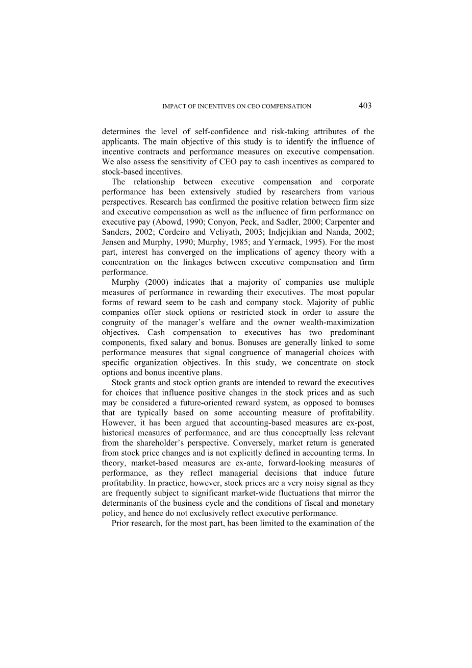薪酬合同随着时间的变化而变化以及巨大的非现金薪酬增加,连同报告要求的变化(关于股票期权授予高管发表),导致对股权薪酬计入支付功能的相关性研究受到大规模关注。使用现金报酬在早先的研究中,作为薪酬模型的唯一非独立变量,认为数据可用性和薪酬合同的现金部分是适当和合理的。然而,为公司高管和员工提供股票期权,股票报酬与总薪酬相关,以及高管关于期权和SEC披露要求的公司显著增加,影响了最近对总薪酬更多的选择的研究(Bertrand and Mullainathan, 2000; Cordeiro and Veliyath, 2003; Core, Guay, and Verrecchia, 2003; Yermack, 1995).