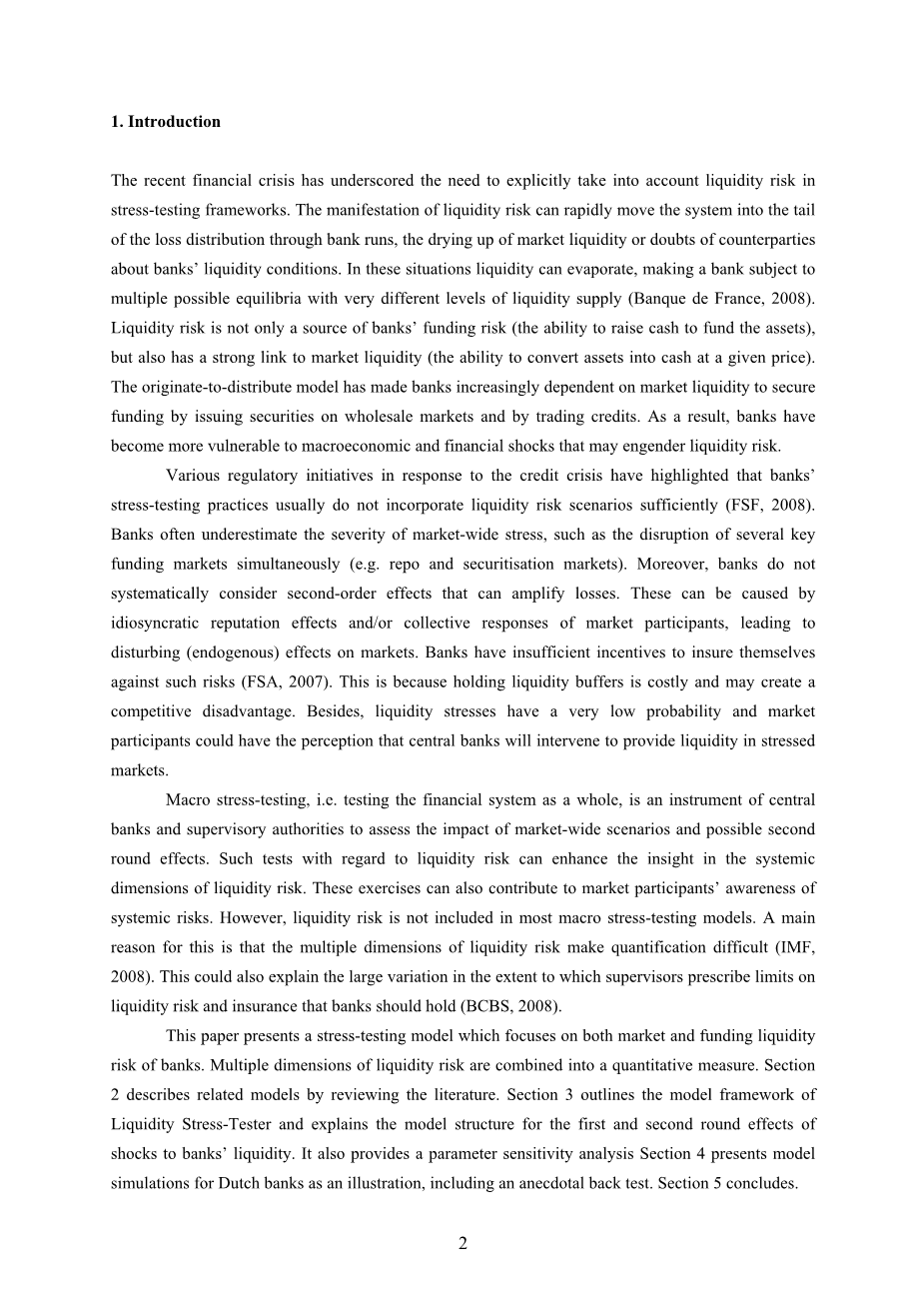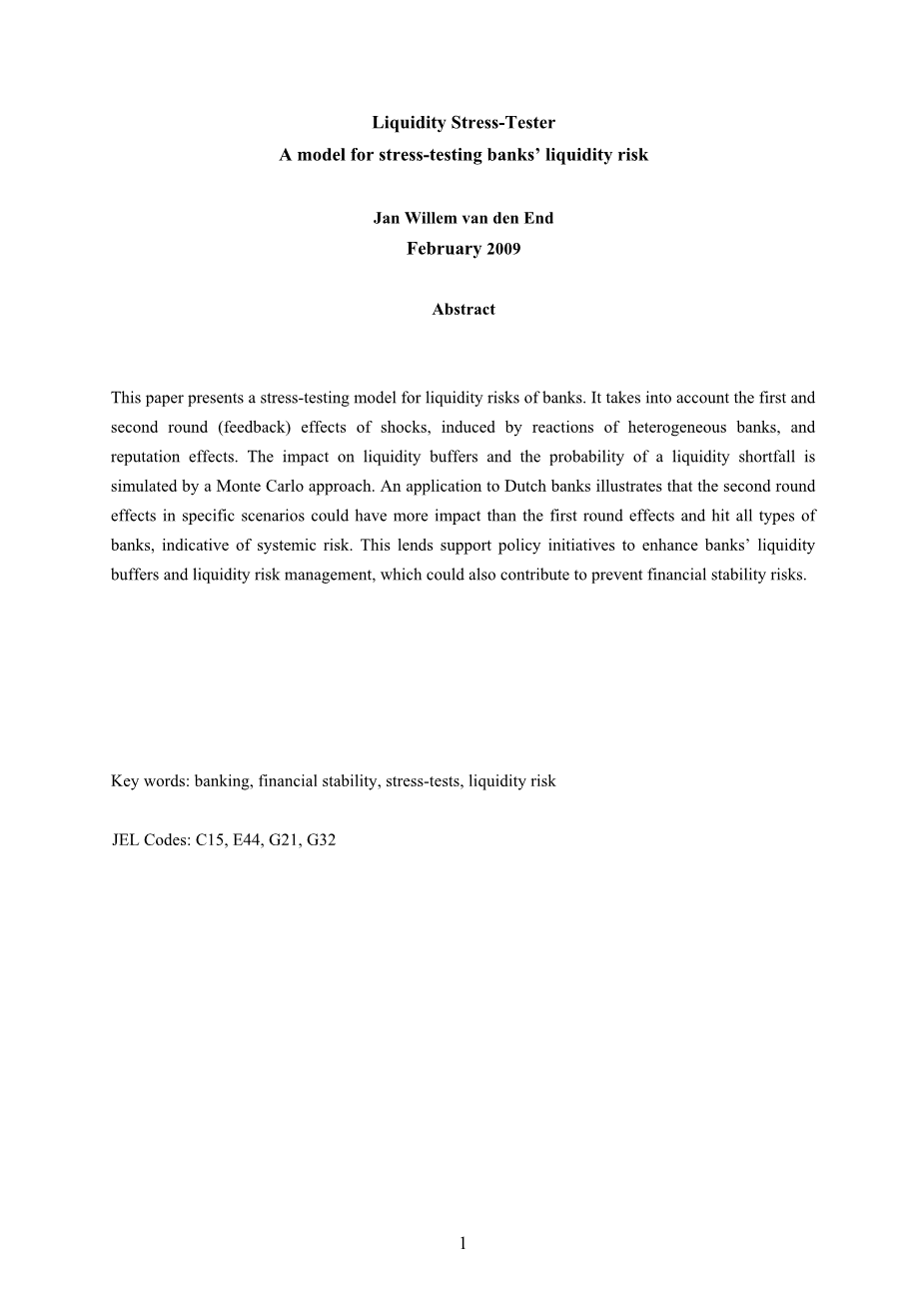 本文介绍其中重点市场和资金流动性的压力测试模型银行的风险。流动性风险的多个维度被组合成的定量测量。部分2通过回顾文献中描述的相关车型。第3节概述的模型框架流动应力测试仪,并解释了第一和第二轮效应模型结构冲击银行的流动性。它还提供了一个参数灵敏度分析第4节模式模拟荷兰银行作为一个例子,包括传闻回测试。第5节总结。2008)。