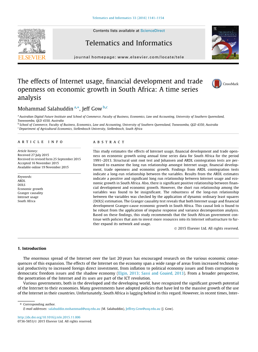 尽管其扮演着越来越大的角色,但证明了互联网直接经济影响力的证据是非常少的。日常经济生活方面。 Frehund和Weinhold(2002)在最早的一项研究中,研究了其影响互联网上的服务和贸易,并发现他们之间的积极和重要的关系。崔(2003)研究了效果的外国直接投资(FDI)使用14个来源国家和53个东道国的小组的数据。该研究使用重力FDI方程应用跨国回归,结果表明,10%的增加东道国互联网用户数量将FDI流入量提高了2%。 Frehund和Weinhold(2004)认为互联网对双边贸易产生积极影响。对53个国家的样本进行时间序列和横截面回归分析,他们发现互联网刺激了贸易流动。该研究进一步声称互联网减少了市场固定进一步促进出口增长的成本。Yi和Choi(2005)调查了互联网对通货膨胀的影响。他们使用合并的OLS和随机效应模型为207个国家的小组。他们的结果表明,互联网用户数量增长了1%,通货膨胀率下降0.42%。 Noh和Yoo(2008)测试了互联网采用,收入不平等之间的实证关系和经济增长。他们在1995 - 2002年期间使用了60个国家的小组,发现互联网的影响经济增长对收入差距高的国家是负面的,因为它阻碍了经济增长的影响互联网。这些调查结果是由于这些国家存在着数字鸿沟,只有少数几个富人数字可以访问它,而绝大多数穷人不能。鉴于南非的高收入差距这里将会有类似的结果。