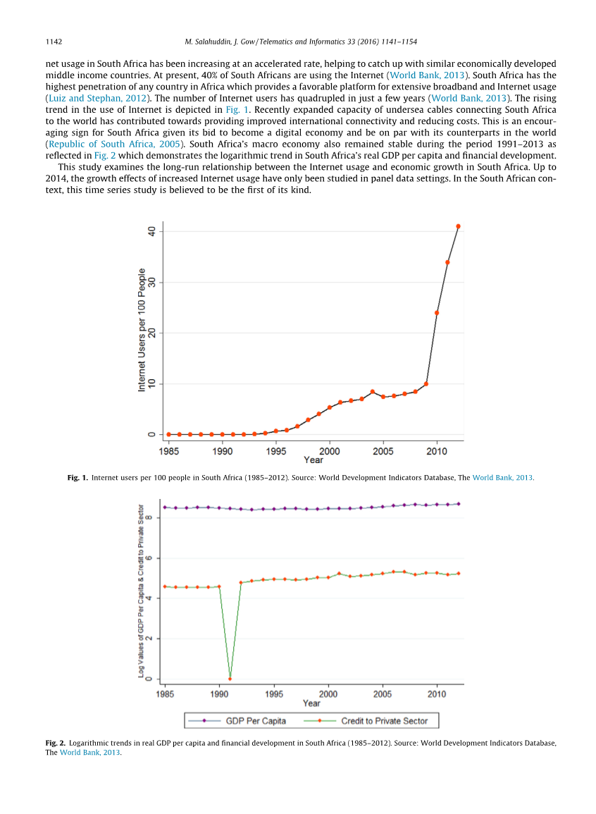 互联网在过去20年中的迅速发展,鼓励对这种扩张所产生的各种经济后果的研究。 互联网对经济的影响遍及各个领域,从提高技术生产力到增加外国直接投资,从通货膨胀到政治经济问题,从腐败到民主自由问题和影子经济(Elgin,2013; Sassi和Goaied,2013)。 从更广泛的角度来说,互联网的渗透及其使用是ICT革命的一部分。发达国家和发展中国家的各国政府已经认识到互联网巨大的增长潜力。许多政府在他们的国家都采取了鼓励互联网发展的政策。不幸的是,南非在这方面落后。不过,最近,南非的互联网用量在加快增长,有助于赶上类似的经济发达中等收入国家目前,40%的南非人正在使用互联网。南非比非洲任何国家的渗透率更高,为宽带和互联网使用提供了有利的平台(Luiz和Stephan,2012)。互联网用户数量在短短几年内翻了两番(世行,2013年)。上升使用互联网的趋势如图1所示。最近扩大连接南非海底电缆的能力向世界贡献了改善的国际连接和降低成本。这是南非的一个令人鼓舞的迹象,因为它决定成为一个数字经济,与世界其他同行一样(南非共和国,2005年)。南非的宏观经济在一九九一至二零一三年期间也保持稳定如图所示。这表明南非人均实际GDP和金融发展的对数趋势。本研究探讨了南非互联网使用与经济增长之间的长期关系。取决于2014年,增加互联网使用量的增长效应只在面板数据设置中进行了研究。在南非,这个时间序列研究被认为是第一次这样的研究。