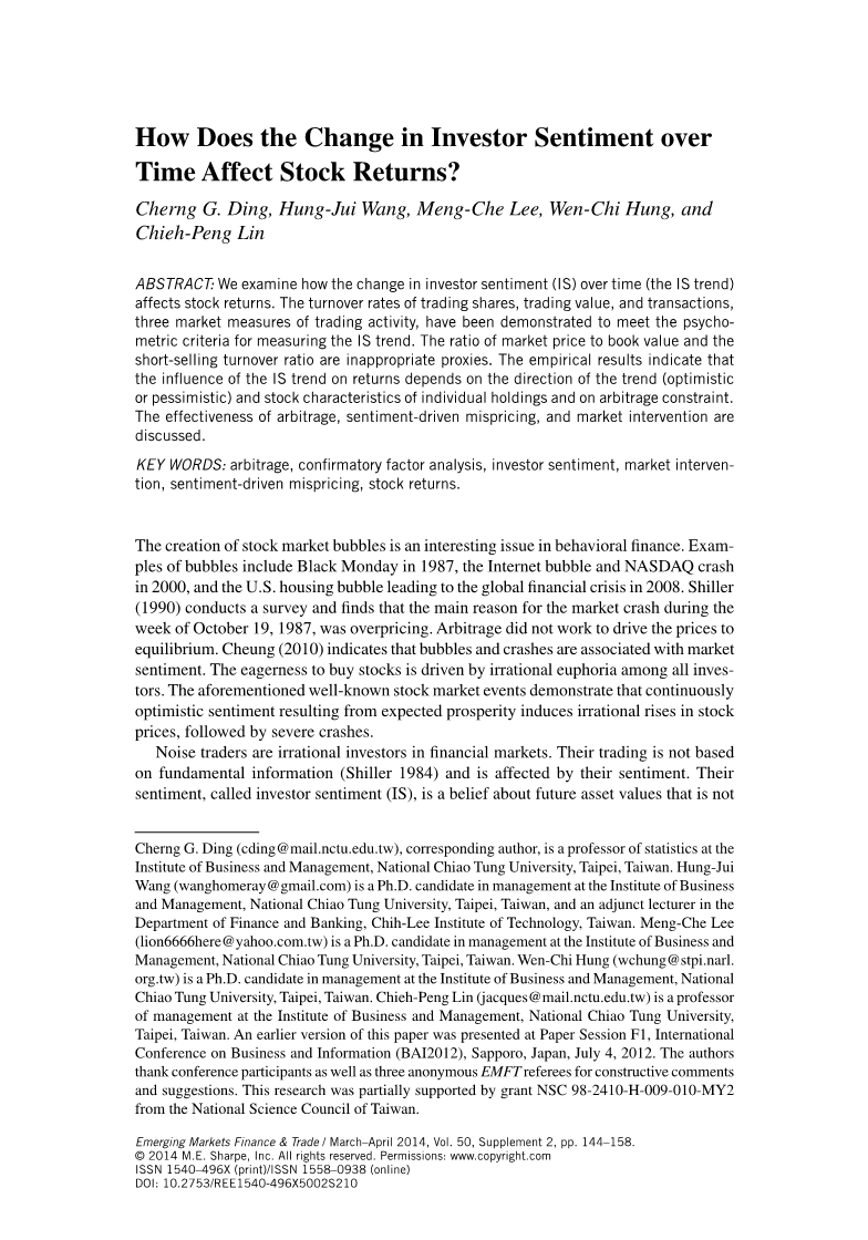 噪音交易者是金融市场的非理性投资者。他们的交易不是基于基本信息(Shiller 1984),而是受到他们的看法的影响。他们的情绪称为投资者情绪(IS),这是对未来资产价值的信念,这是事实无关的(Baker and Wurgler 2007)。根据噪声交易者理论(DeLong等,1990),当套利有限时,IS可以影响股票收益。