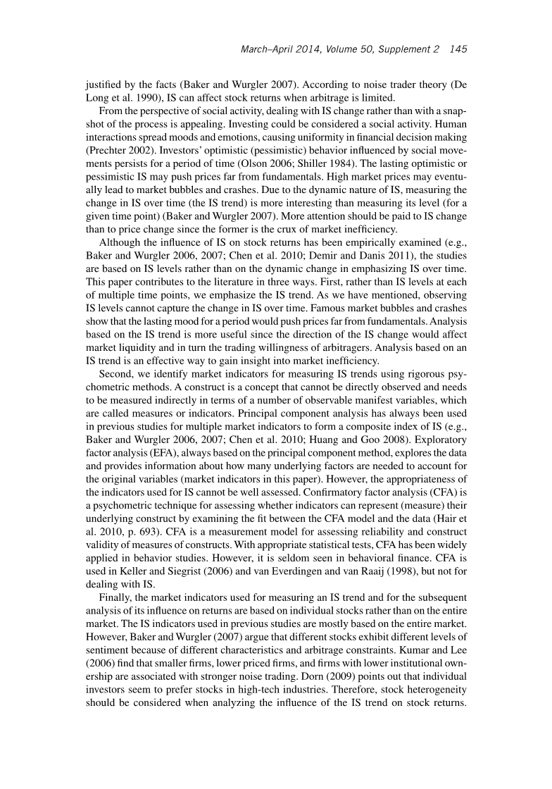 从社会活动的角度来看,处理信息系统的变化而不是过程的快照是吸引人的。投资可以被认为是社会活动。人际交往扩大情绪和情绪,导致财务决策的统一(Prechter 2002)。受社会运动影响的投资者的乐观(悲观)行为持续一段时间(Olson 2006; Shiller 1984)。持续的乐观或悲观的IS可能推动价格远离基本面。高市价可能最终导致市场泡沫和崩溃。由于IS的动态性质,测量IS随时间变化(IS趋势)比测量其水平(给定时间点)更有意义(Baker和Wurgler 2007)。因为前者是市场效率低下的关键,因此应该更多关注IS变化而不是价格变动。