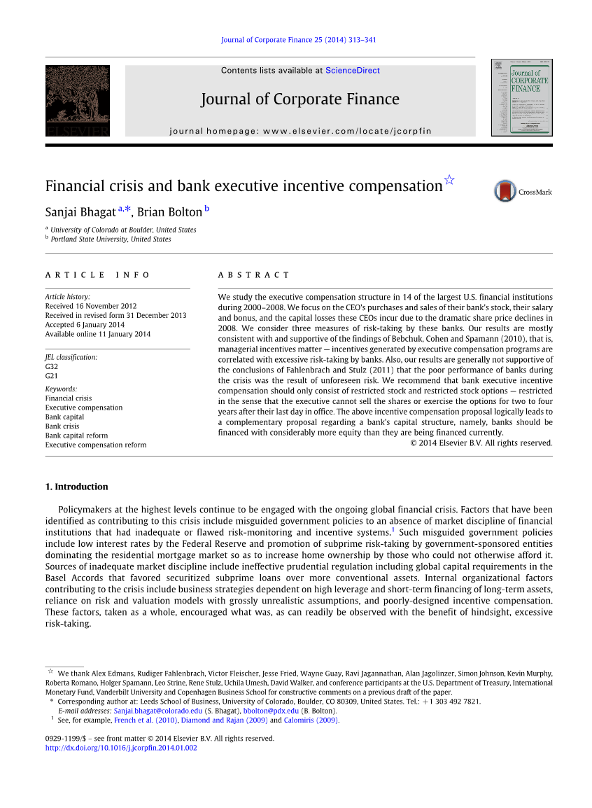 我们研究了2000-2008年期间美国14家最大金融机构的高管薪酬结构。我们关注的是首席执行官的薪酬、奖金和对其银行股票的买卖,以及这些首席执行官因2008年股价大幅下跌而遭受的资本损失。我们考虑了这些银行采取的三种风险承担措施。我们的研究结果与Bebchuk、Cohen和Spamann(2010)的研究结果基本一致,也就是说,高管薪酬计划产生的管理激励与银行过度承担风险有关。此外,我们的结果不支持Fahlenbrach和Stulz(2011)的结论,即银行在危机期间表现不佳是不可预见风险的结果。我们建议,银行高管激励薪酬应仅包括限制性股票和限制性股票期权,限制性股票期权是指高管在其最后一天任职后的2至4年内不能出售股票或行使期权。上述激励性薪酬方案在逻辑上引出了银行资本结构的互补性建议,即银行应以比目前融资更多的股本融资。