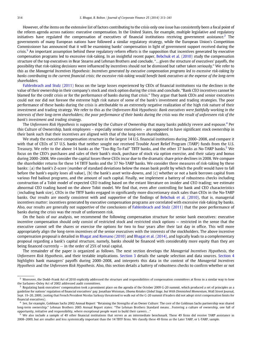 Fahlenbrach和Stulz(2011)专注于金融机构首席执行官在危机期间通过其公司股票和股票期权的所有权价值下降而遭受的巨大损失,并得出结论:“银行CEO激励措施不能归咎于信贷危机他们认为银行的首席执行官和高级管理人员不能也不会预见到银行某些投资和交易策略的极高风险性质。这些银行在危机期间表现不佳的原因是他们的投资和交易策略的高风险性极为负面。我们将此称为不可预见的风险假设:银行高管忠实地为其长期股东的利益工作;危机期间银行业绩不佳是银行投资和交易策略无法预料的风险所致。