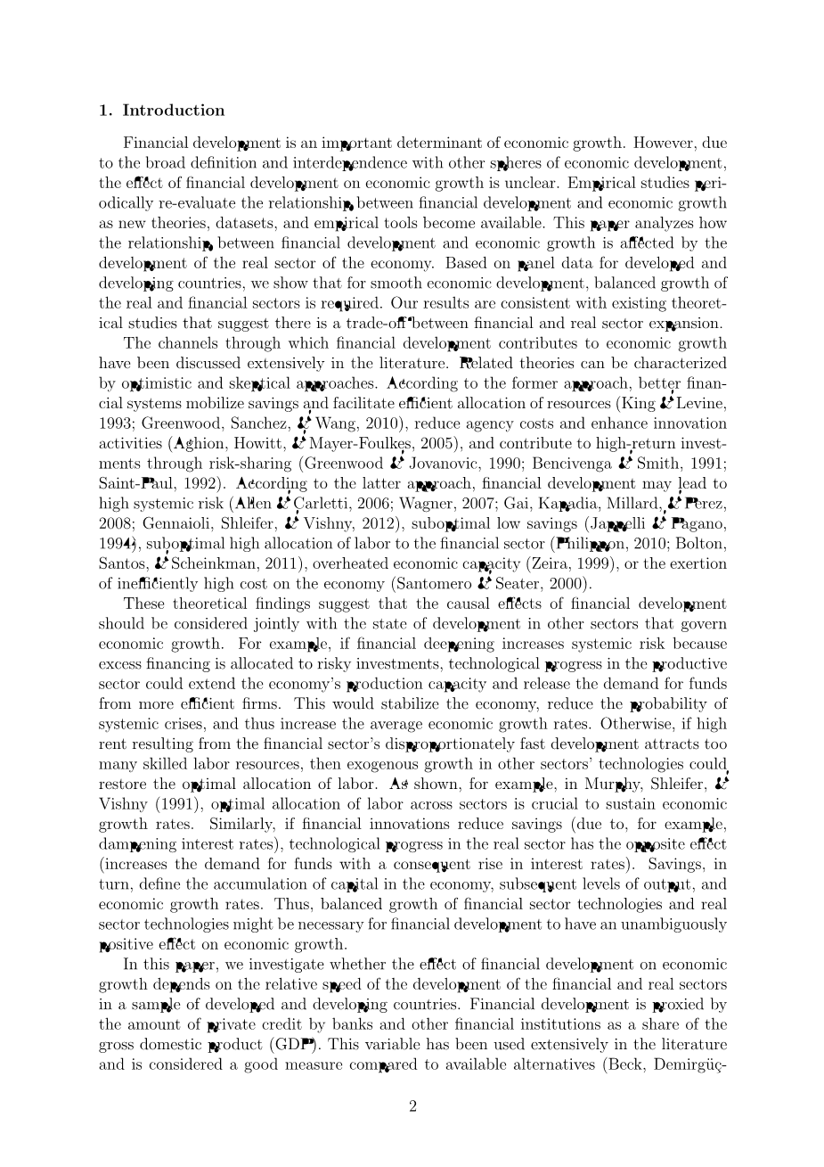 在以往文献中广泛讨论了金融发展对经济增长的贡献途径。相关理论是用乐观和怀疑的方法来描述的。根据以前的研究,更好的金融系统可以调动储蓄并促进资源的有效分配(Kingamp;Levine,1993;Greenwood、Sanchez和Wang,2010),降低代理成本并加强创新活动(Aghion、Howitt和Mayer Foulkes,2005),并通过风险分担促进高回报投资(Greenwoodamp;Jovanovic,1990年;Bencivengaamp;Smith,1991年;圣保罗,1992年)。根据后一种方法,金融发展可能导致高系统性风险(Allenamp;Carletti,2006;Wagner,2007;Gai,Kapadia,Millard,amp;Perez,2008;Gennaioli,Shleifer,amp;Vishny,2012);次优低储蓄(Jappelliamp;Pagano,1994);次优高劳动力分配给金融部门(Philippon,2010;Bolton,Santos,amp;Schein)kman,2011),《经济能力过热》(Zeira,1999),或对经济的低效率高成本作用(Santoperoamp;Seater,2000)。