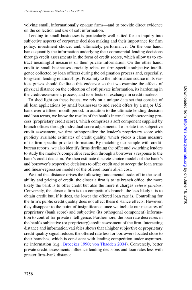 摘要:我们研究在信息不对称的信贷市场上,物理距离对私人信息获取和使用的影响。我们用一个涵盖所有小企业向大型银行进行贷款申请的一个独特数据库进行研究,研究表明:债务人离债权人近有利于软信息的收集,这为在信贷的可用性和定价方面提供权衡比较,尽管在其他条件相同的情况下利率较高,但附近的公司更容易获得信贷。然而,距离削弱了我们的债权人收集专有情报和开拓本地专属市场的能力,这表明必要的软信息在借贷关系中是主要的影响因素。