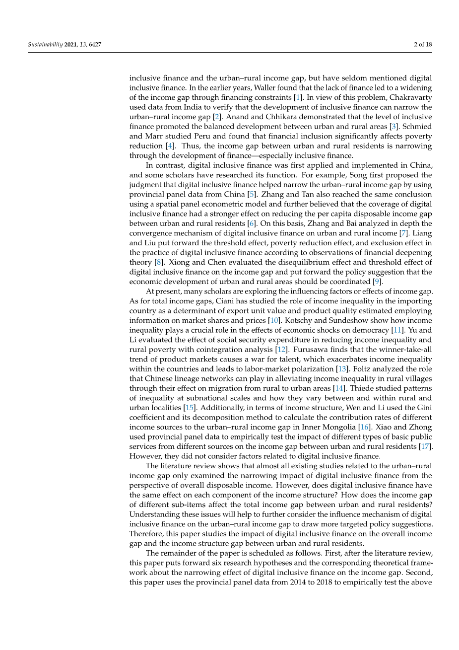 论文的其余部分安排如下。首先,在文献综述的基础上,本文提出了数字普惠金融缩小收入差距效应的六个研究假设和相应的理论框架。其次,本文采用2014 - 2018年省级面板数据对上述结果进行了实证检验,用面板数据模型进行假设。第三,本文对结果进行了分析,并对各子项目的收入差距提出了相应的建议