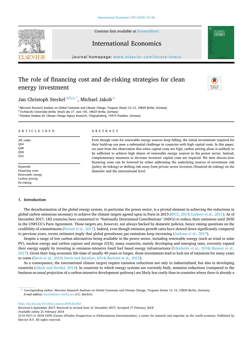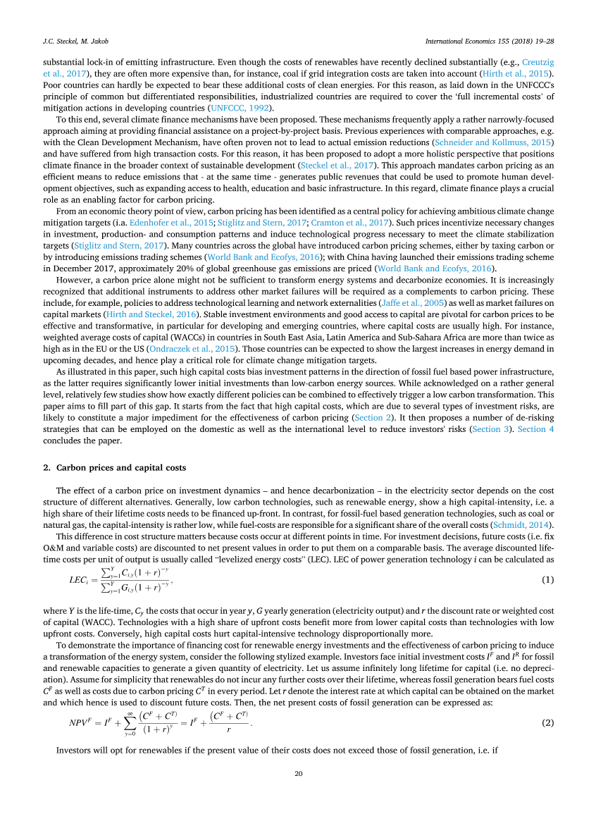 如本文所述,如此高的资本成本使投资模式偏向以化石燃料为基础的电力基础设施,因为与低碳能源相比,后者所需的初始投资要低得多。虽然在相当普遍的层面上得到承认,但相对较少的研究表明如何将不同的政策结合起来有效地触发低碳转型。本文旨在填补这一空白。首先是由于多种投资风险导致的高资本成本可能构成碳定价有效性的主要障碍(第2 节)。然后,它提出了一些可以在国内和国际层面采用的去风险策略,以降低投资者的风险(第3节)。第 4 节总结了本文。
